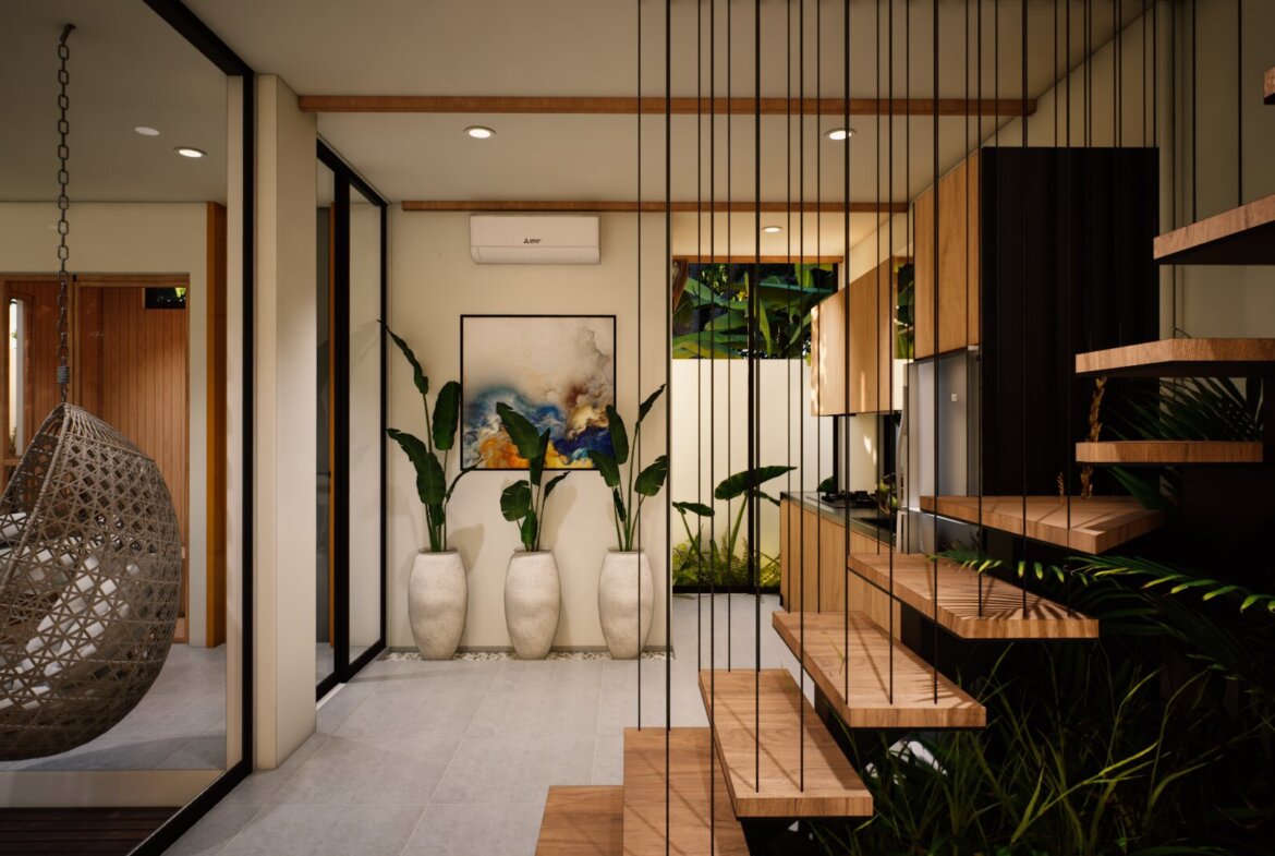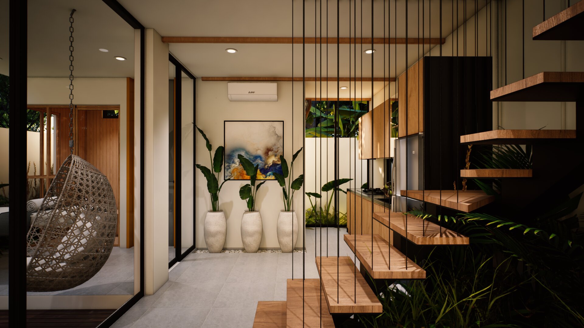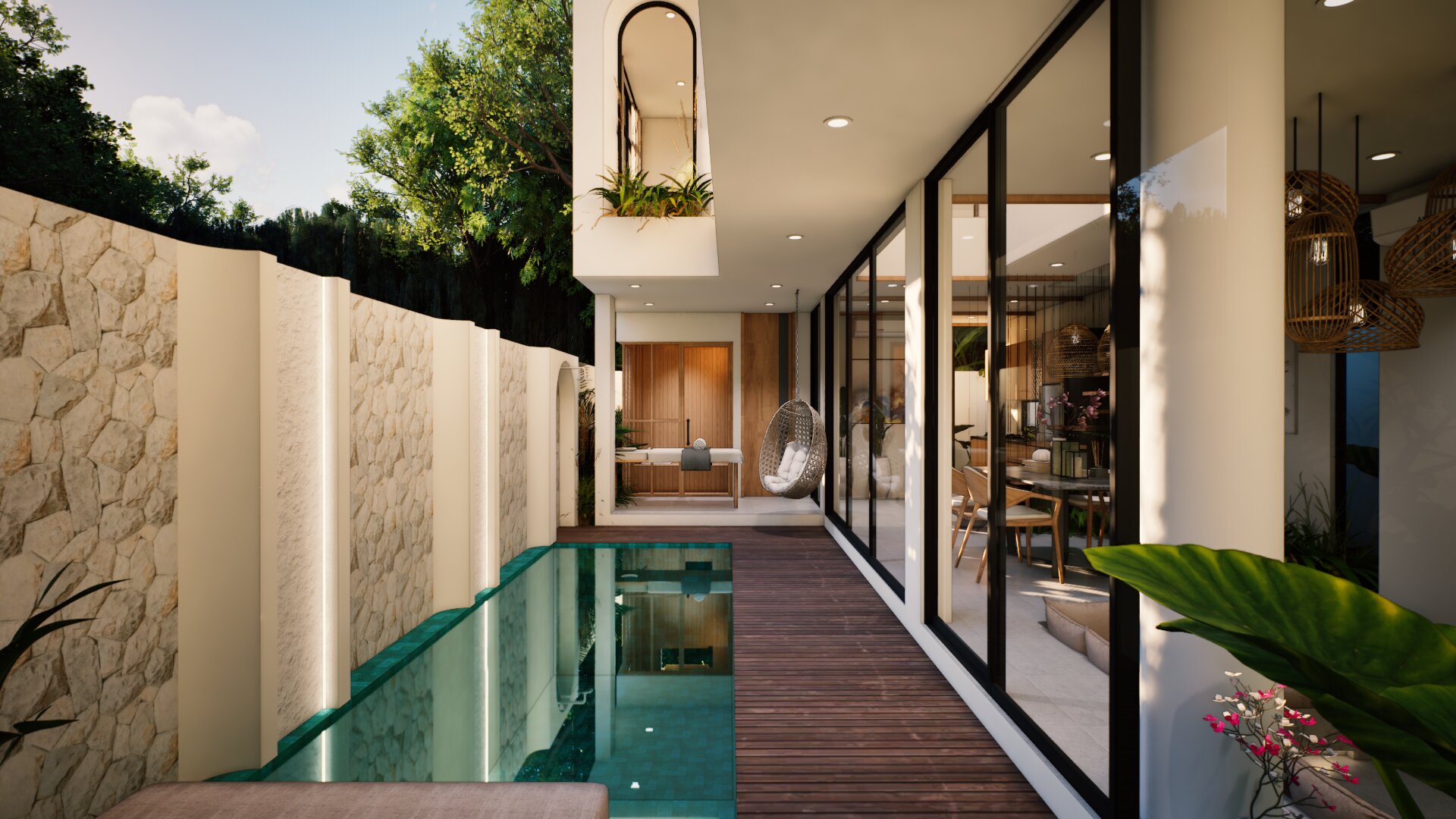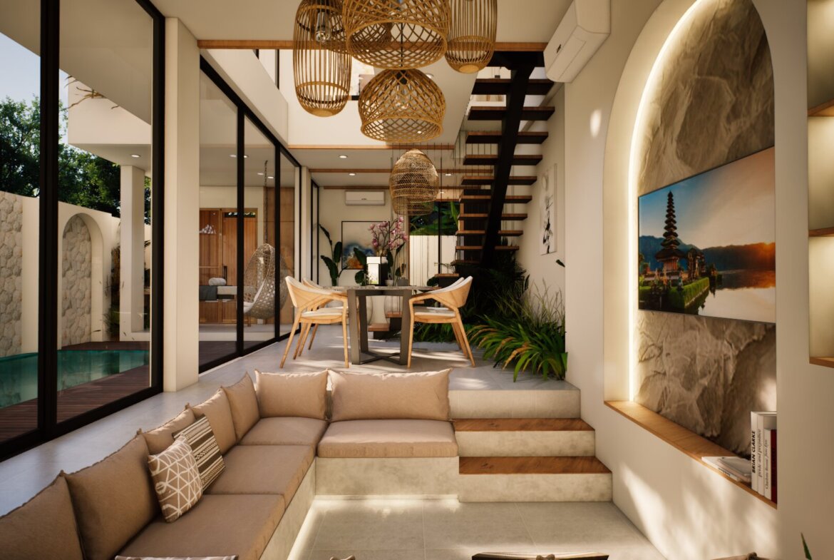 Step into a refined two-bedroom villa thoughtfully designed for effortless tropical living. Spanning two floors beneath a sleek bitumen roof, the layout emphasizes space, light, and flow. The living areas feature a sunken lounge that invites relaxation, while the open-to-sky dining area allows you to enjoy Bali’s gentle breezes and natural sunlight. The seamless indoor-outdoor connection ensures a tranquil environment where every corner feels airy and welcoming.