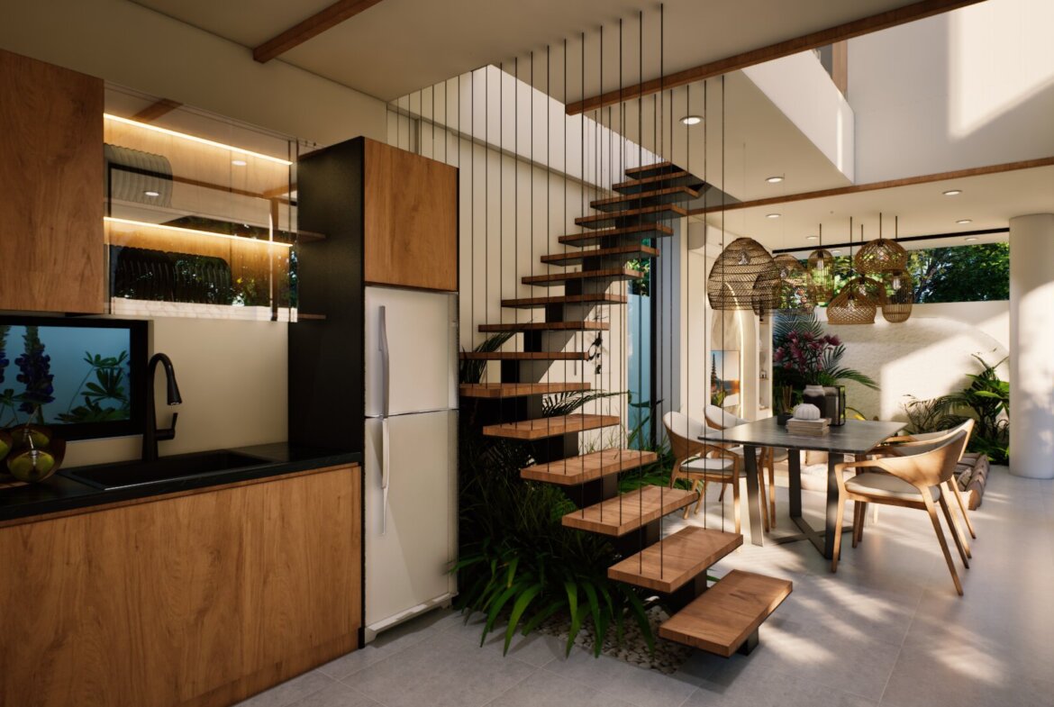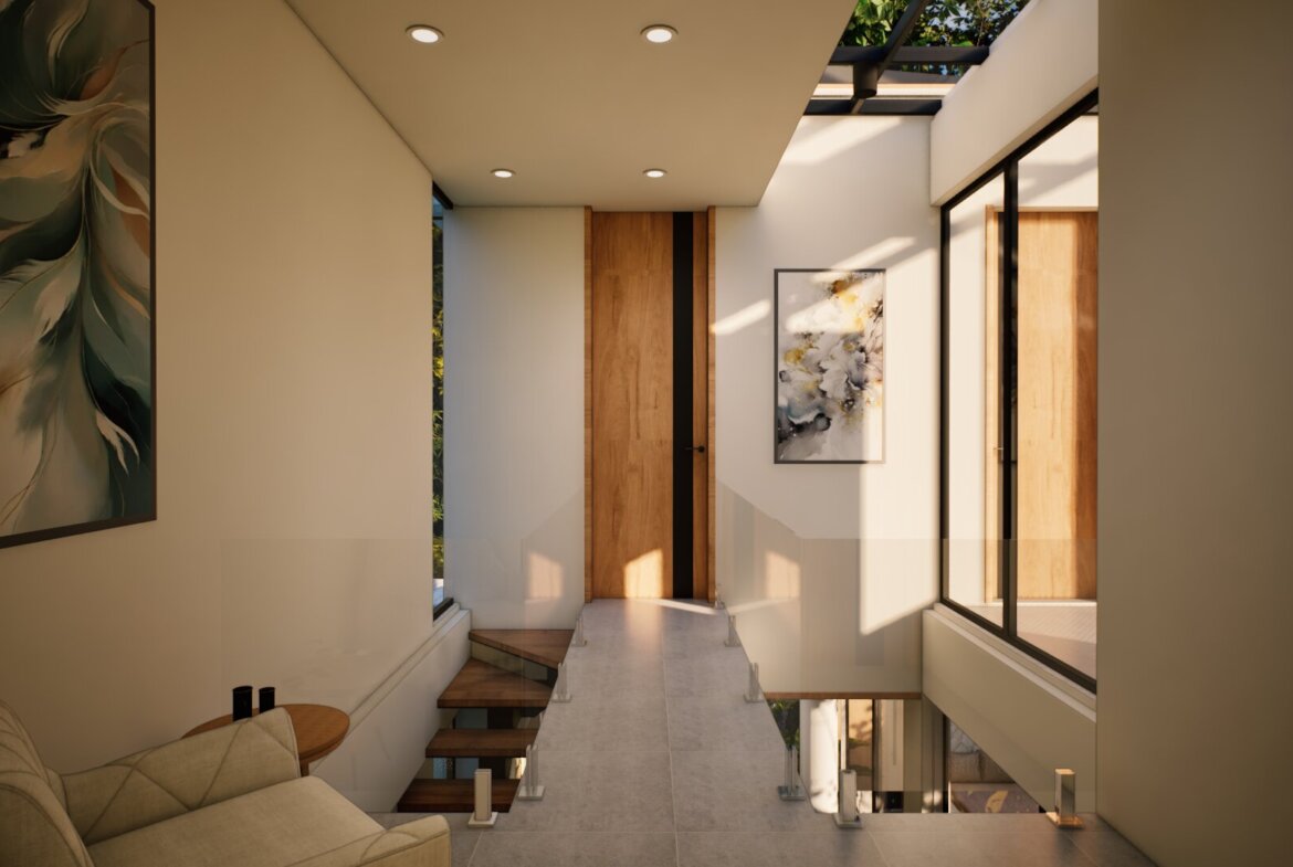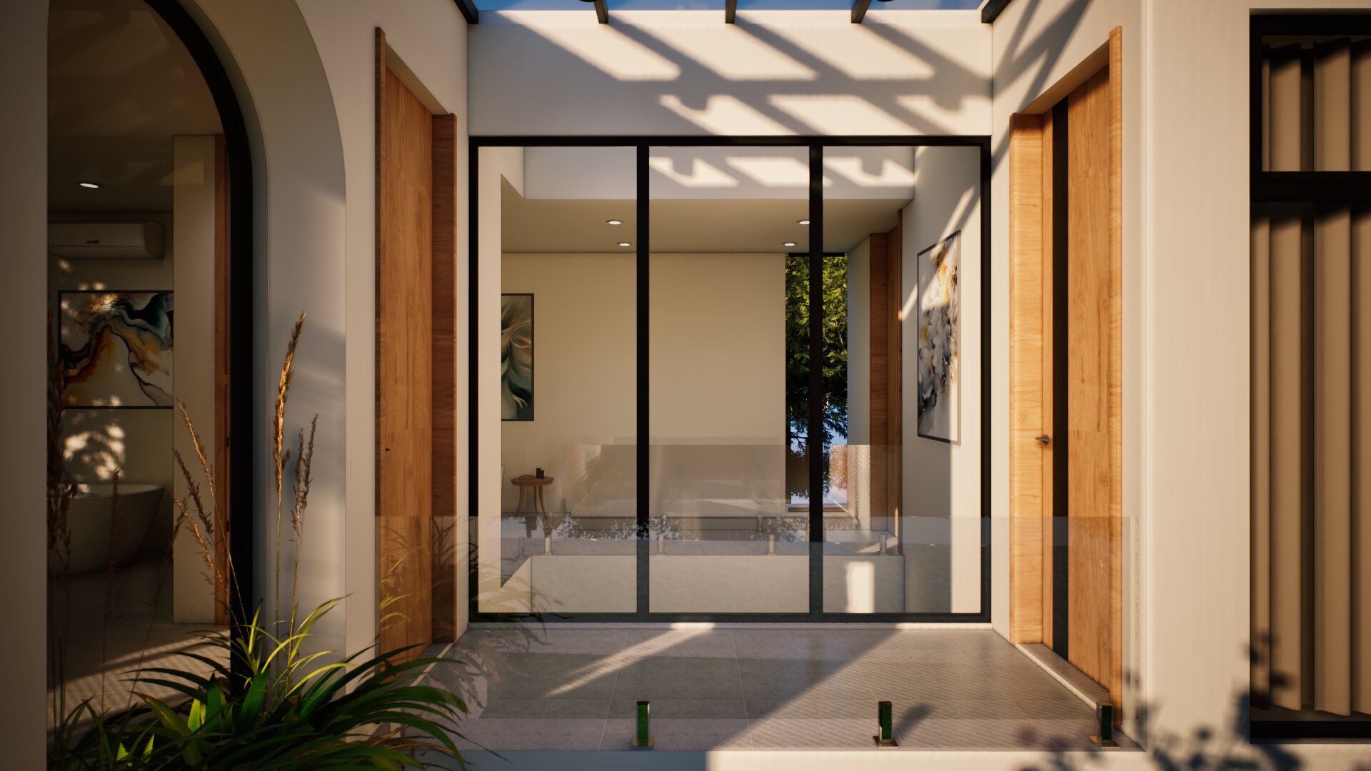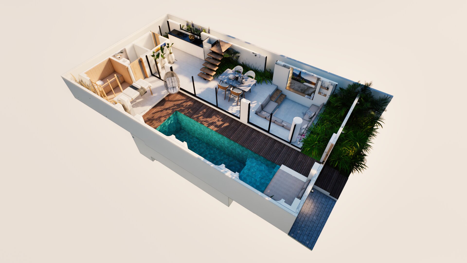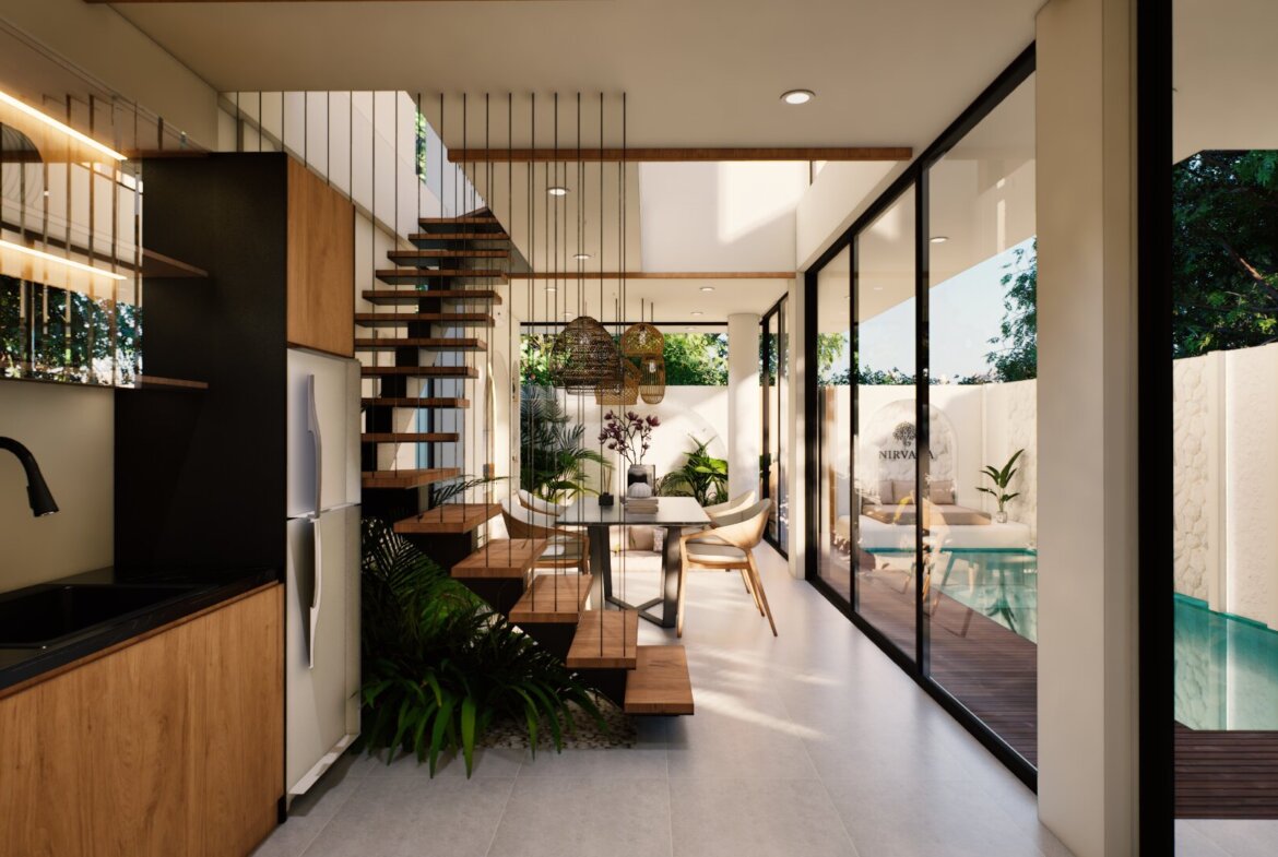 Step into a refined two-bedroom villa thoughtfully designed for effortless tropical living. Spanning two floors beneath a sleek bitumen roof, the layout emphasizes space, light, and flow. The living areas feature a sunken lounge that invites relaxation, while the open-to-sky dining area allows you to enjoy Bali’s gentle breezes and natural sunlight. The seamless indoor-outdoor connection ensures a tranquil environment where every corner feels airy and welcoming.