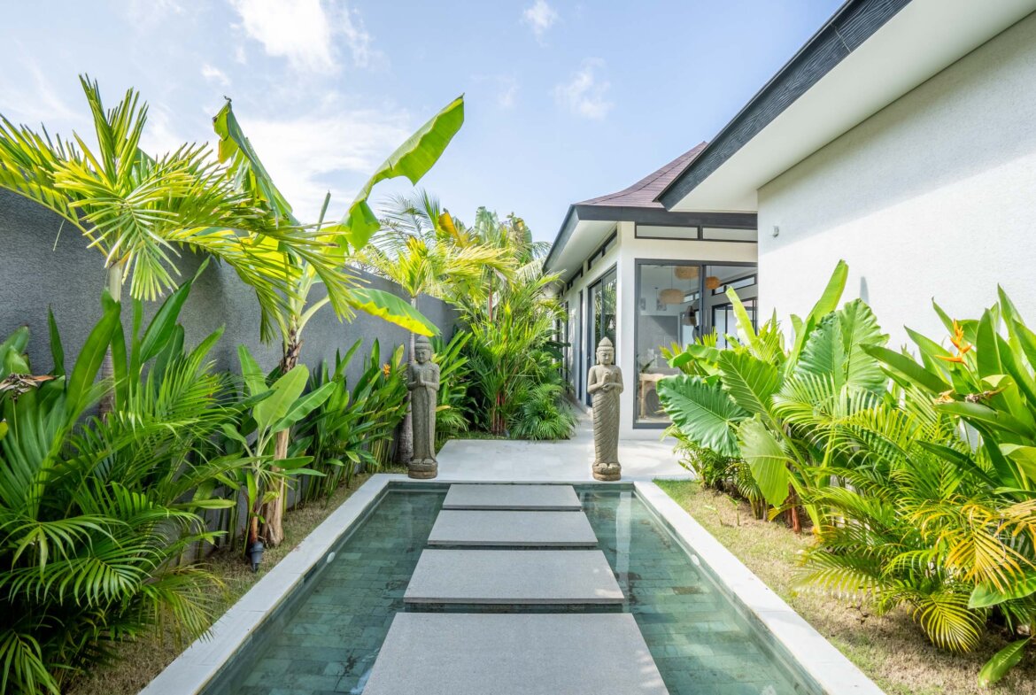 Inside, the villa features three spacious bedrooms, each fitted with king-size beds, ensuite bathrooms, and elegant open-air showers that enhance the tropical living experience. The interiors are bright and airy, with expansive windows and an open-plan layout that allows natural light to flow effortlessly throughout the living and dining spaces. A fully equipped kitchen sits at the heart of the home, perfect for daily living or entertaining, while the seamless connection to the outdoor area invites a relaxed and comfortable lifestyle.