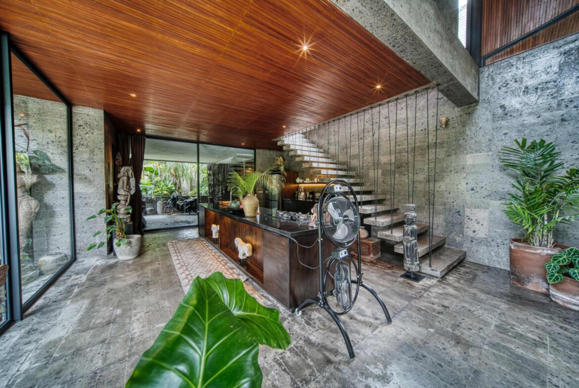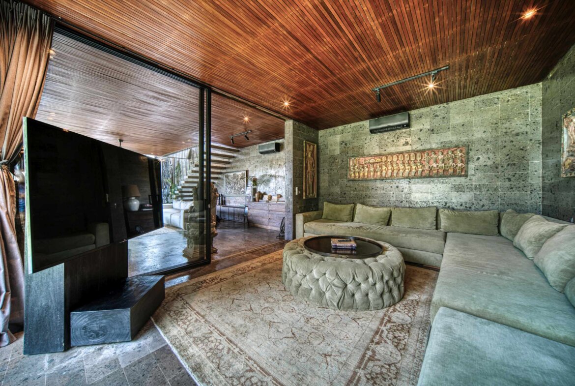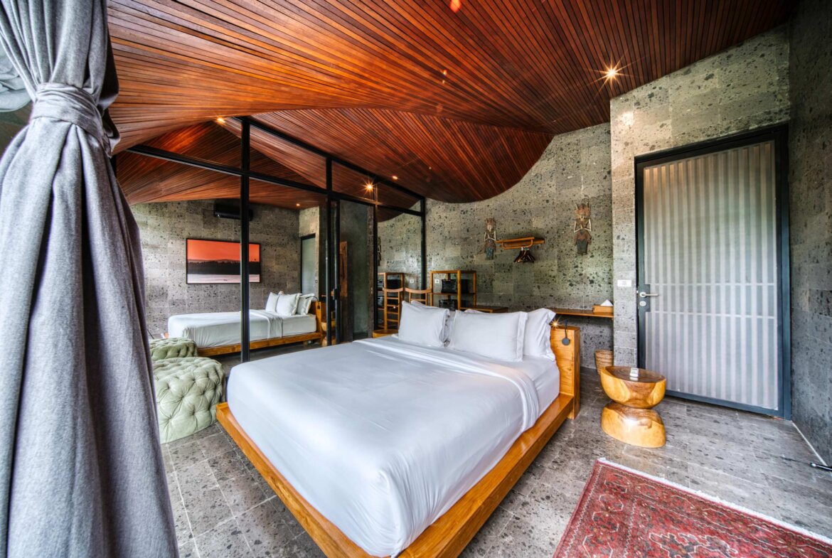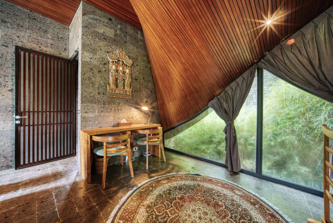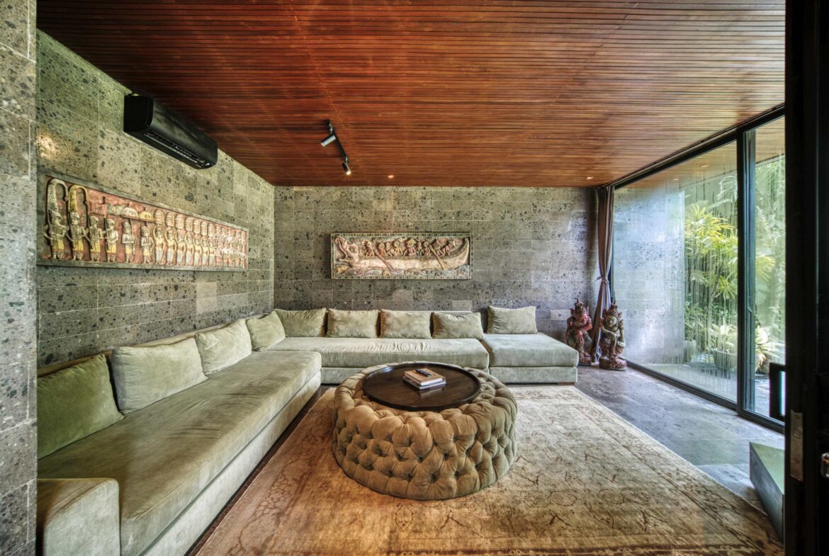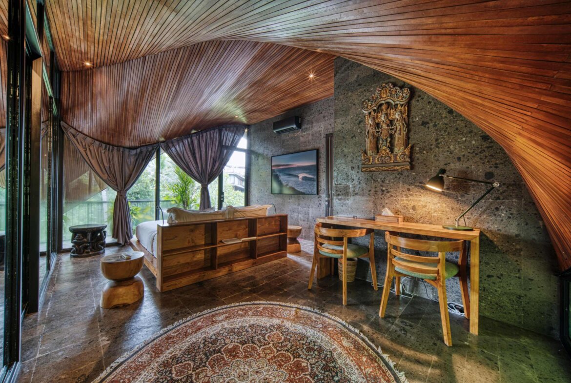 The choice of materials speaks to a reverence for sustainability and Balinese heritage, with ’Kerobokan stone’—a revered local hard sandstone—and warm woods adorning the interior roof, marrying tradition with modernity.