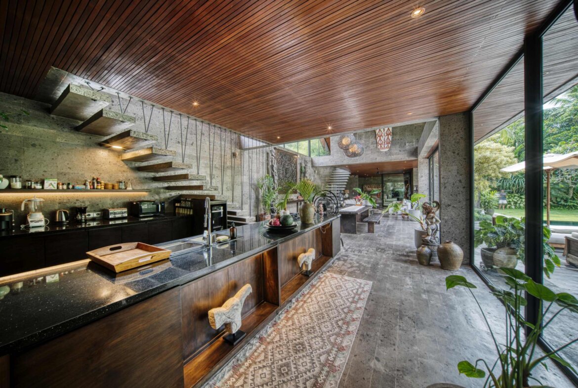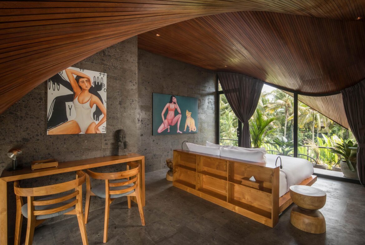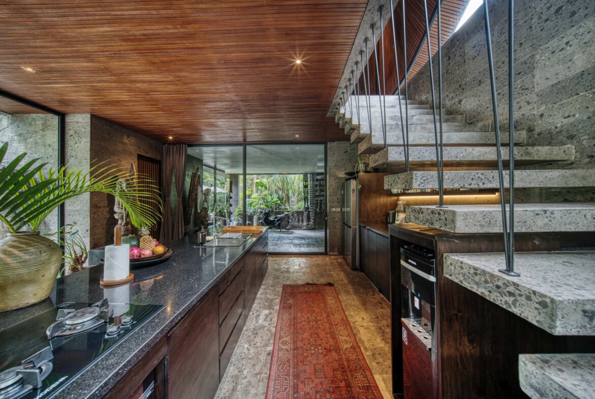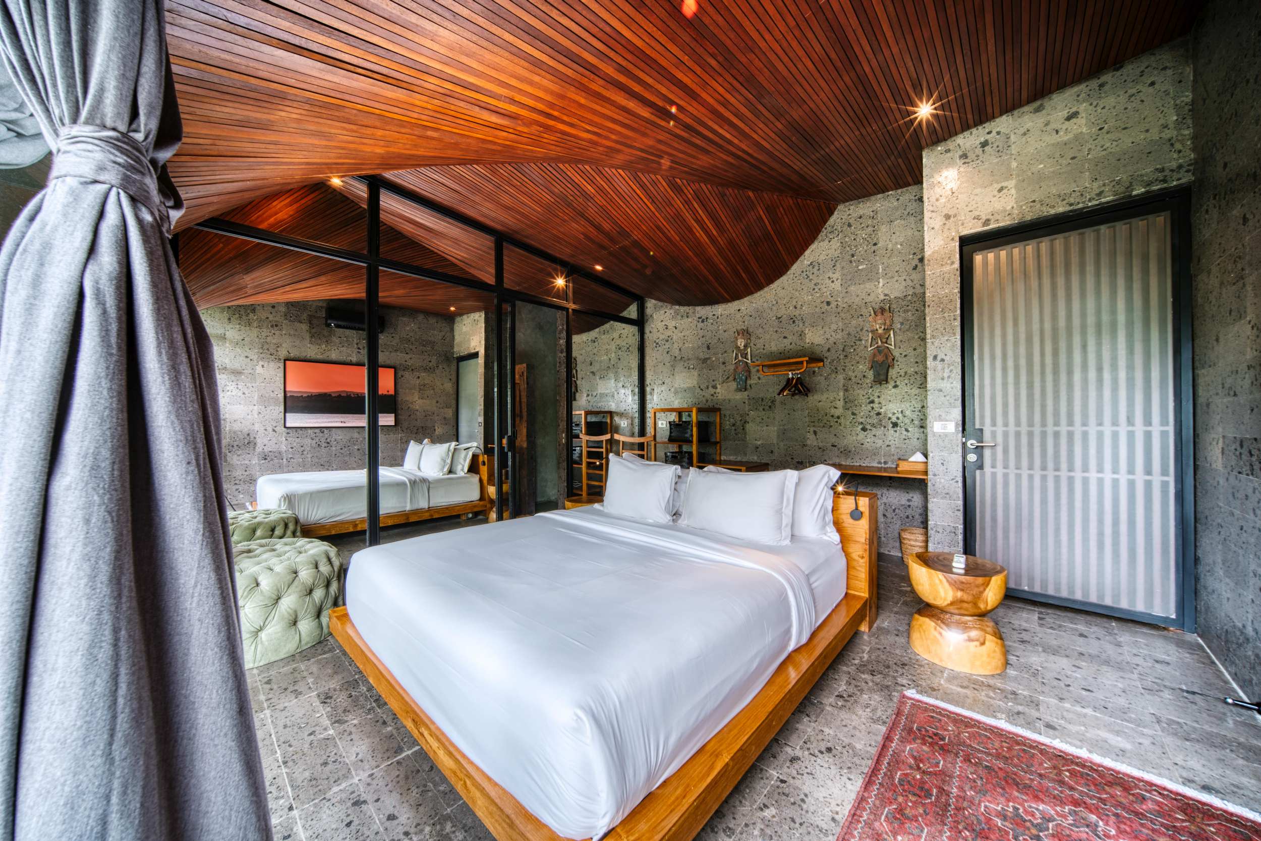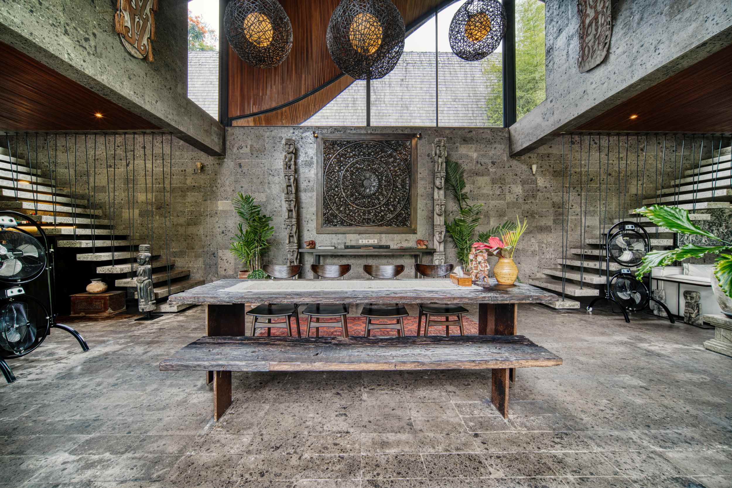 The choice of materials speaks to a reverence for sustainability and Balinese heritage, with ’Kerobokan stone’—a revered local hard sandstone—and warm woods adorning the interior roof, marrying tradition with modernity.