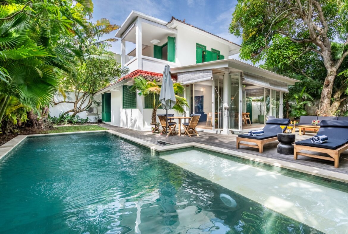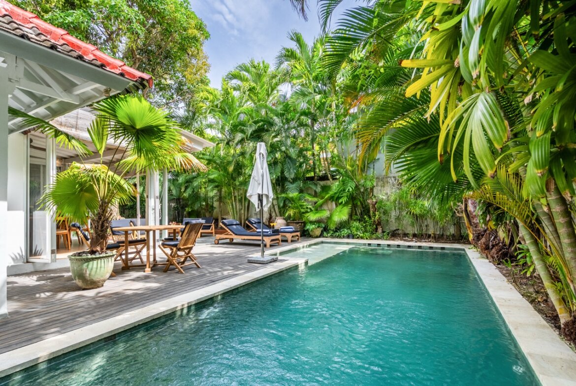 The outdoor area is perfect for enjoying Bali’s tropical lifestyle, with sun loungers by the pool, a wooden deck, and a well maintained garden.