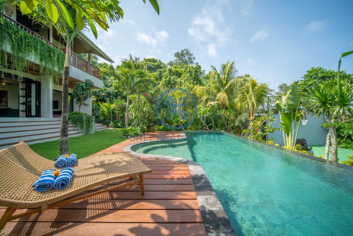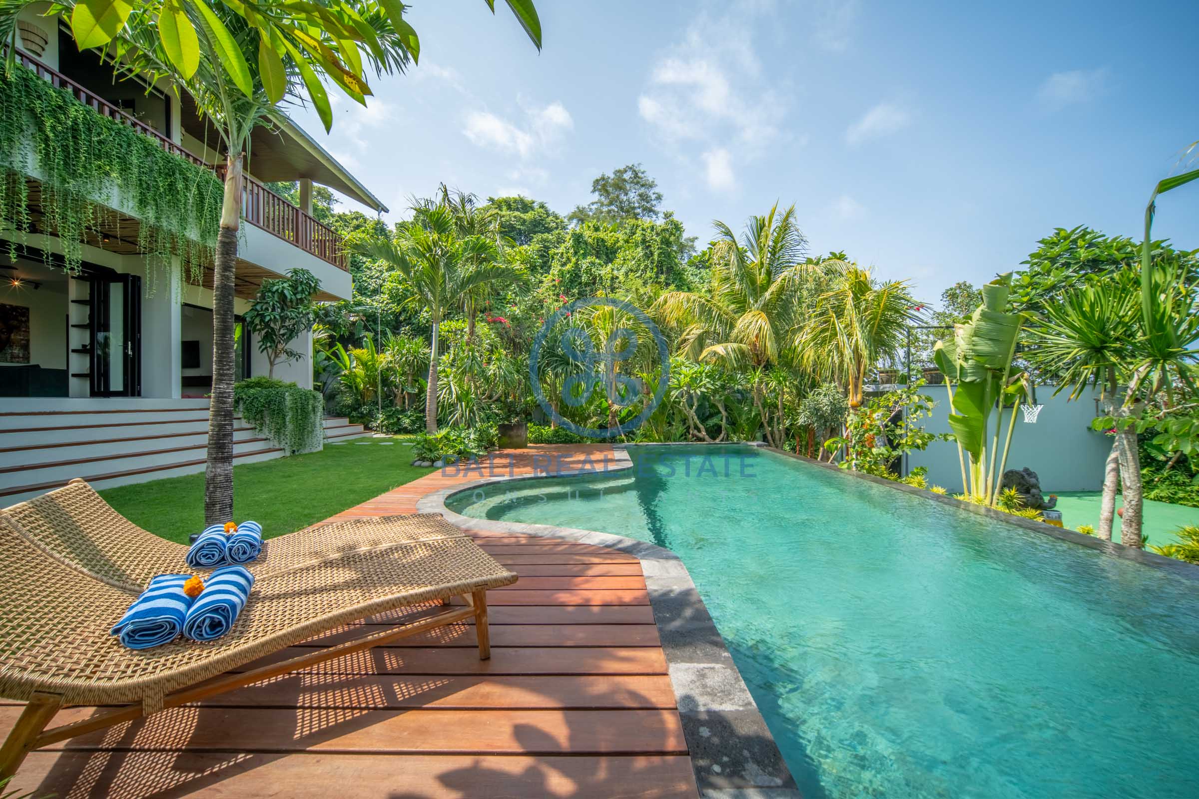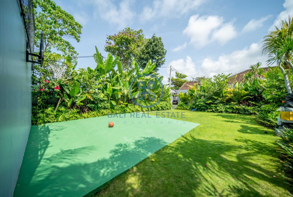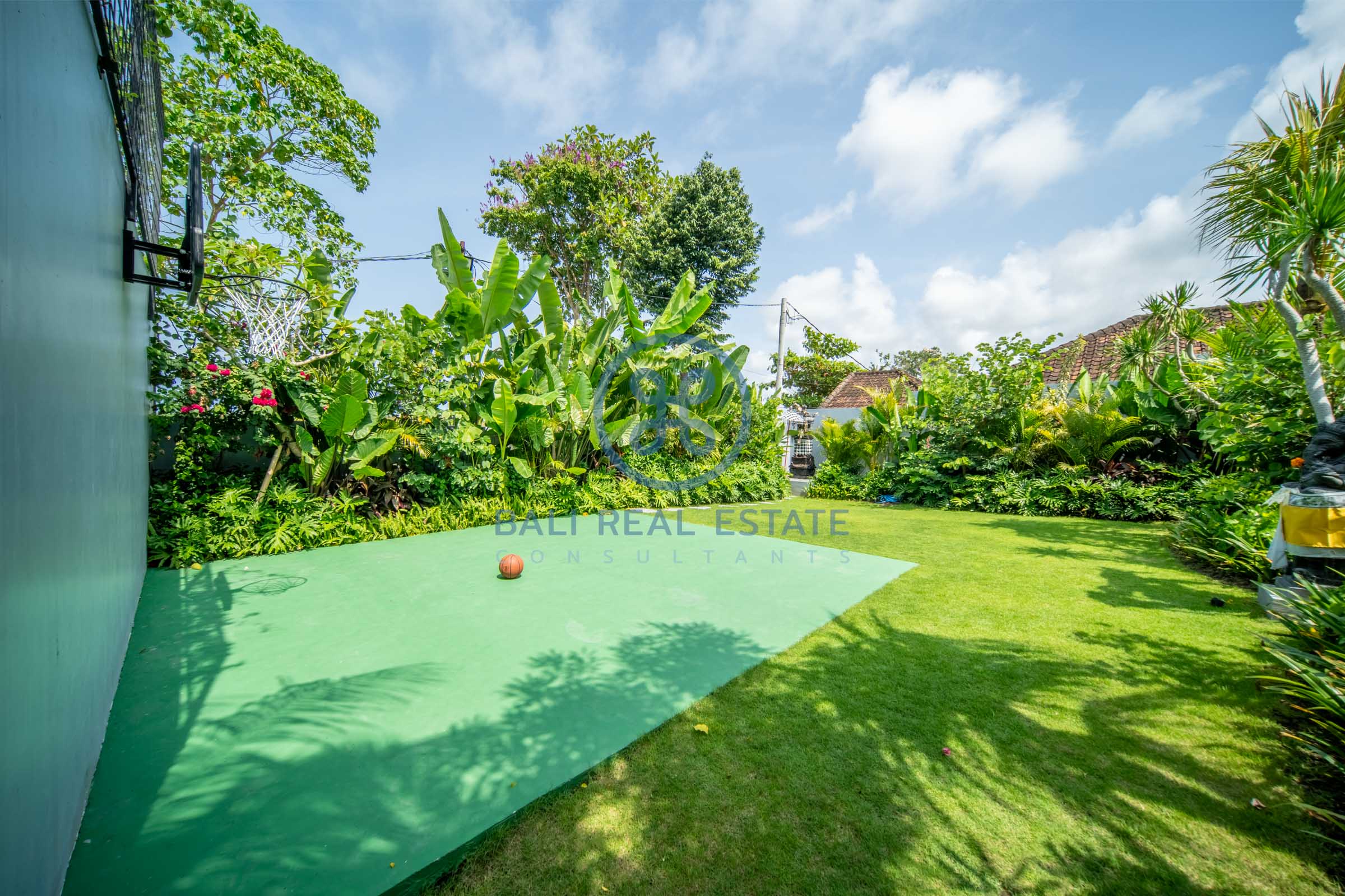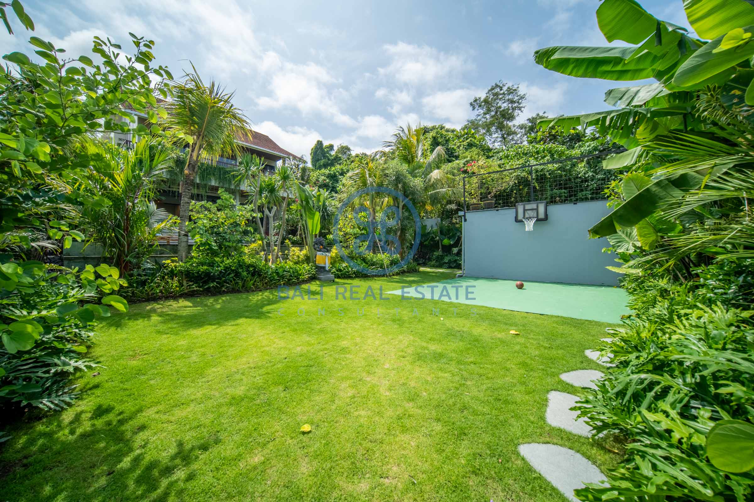 The outdoor space is a true highlight, featuring a spacious tropical garden that offers plenty of room for families to relax, play, and enjoy outdoor living. A private swimming pool sits at the heart of the garden, complete with a generous pool deck that overlooks the serene jungle and rice field views. A dedicated basketball court adds yet another layer of fun and daily wellness to this beautifully designed outdoor area.