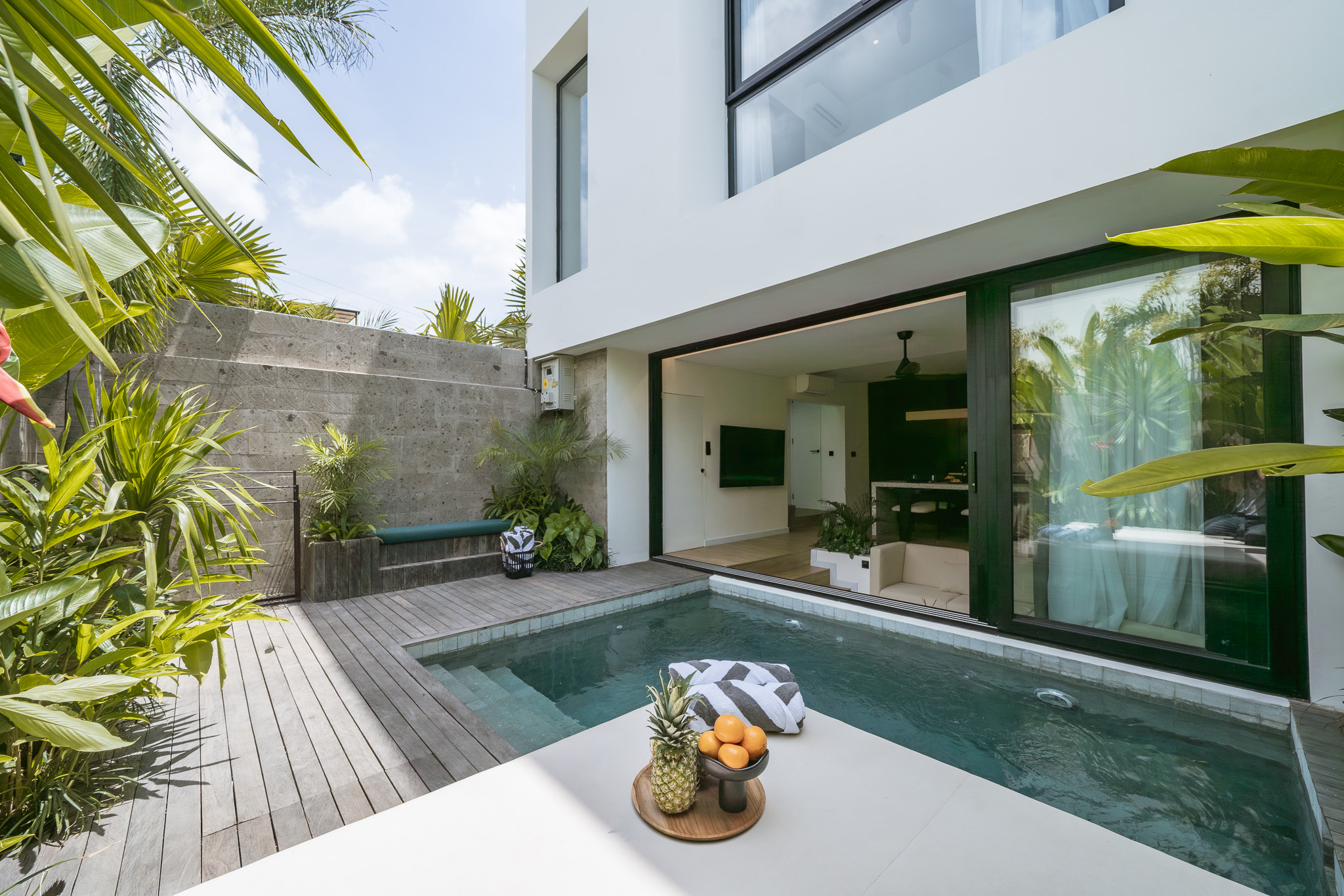 As you step into this elegant abode, you are welcomed by a thoughtfully designed open-plan living and dining area that creates a bright, spacious, and inviting atmosphere. The living space seamlessly opens toward the crystal-clear swimming pool, which serves as a tranquil focal point and fills the interior with a soothing, resort-like ambiance.