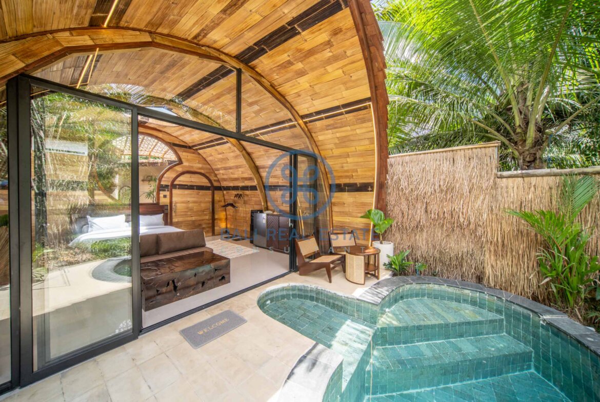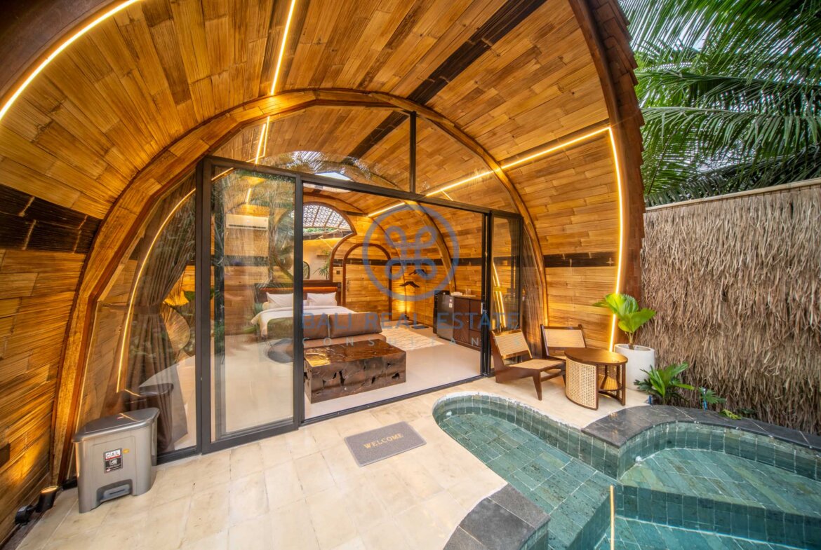 This beautifully crafted bamboo villa offers a unique and profitable investment opportunity in Ubud’s lush jungle landscape. Built entirely from high-quality bamboo and surrounded by tropical greenery, the property is a consistently high-performing Airbnb frequently booked for romantic getaways and anniversary stays, with nightly rates ranging from €150 – €210.