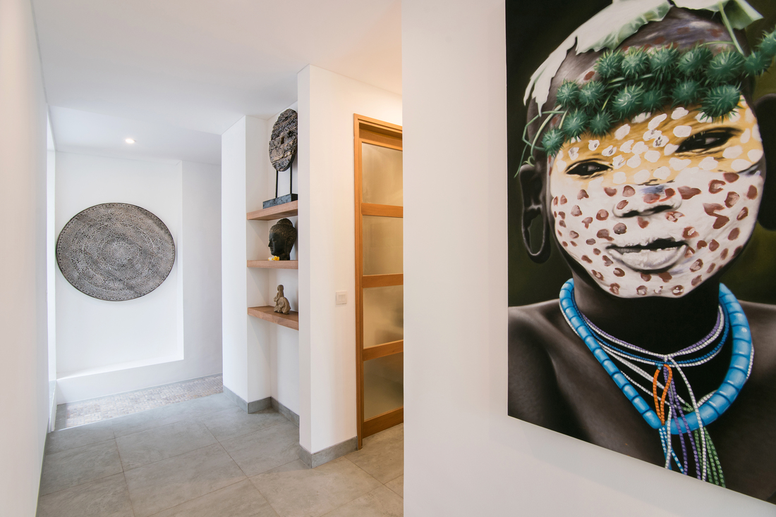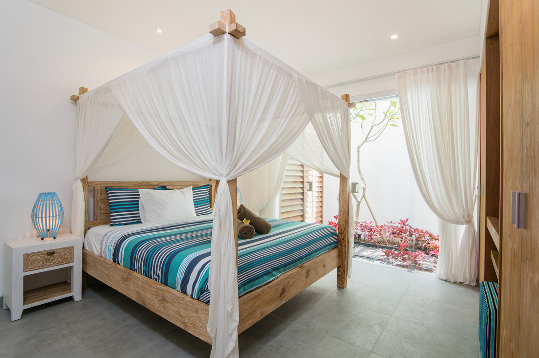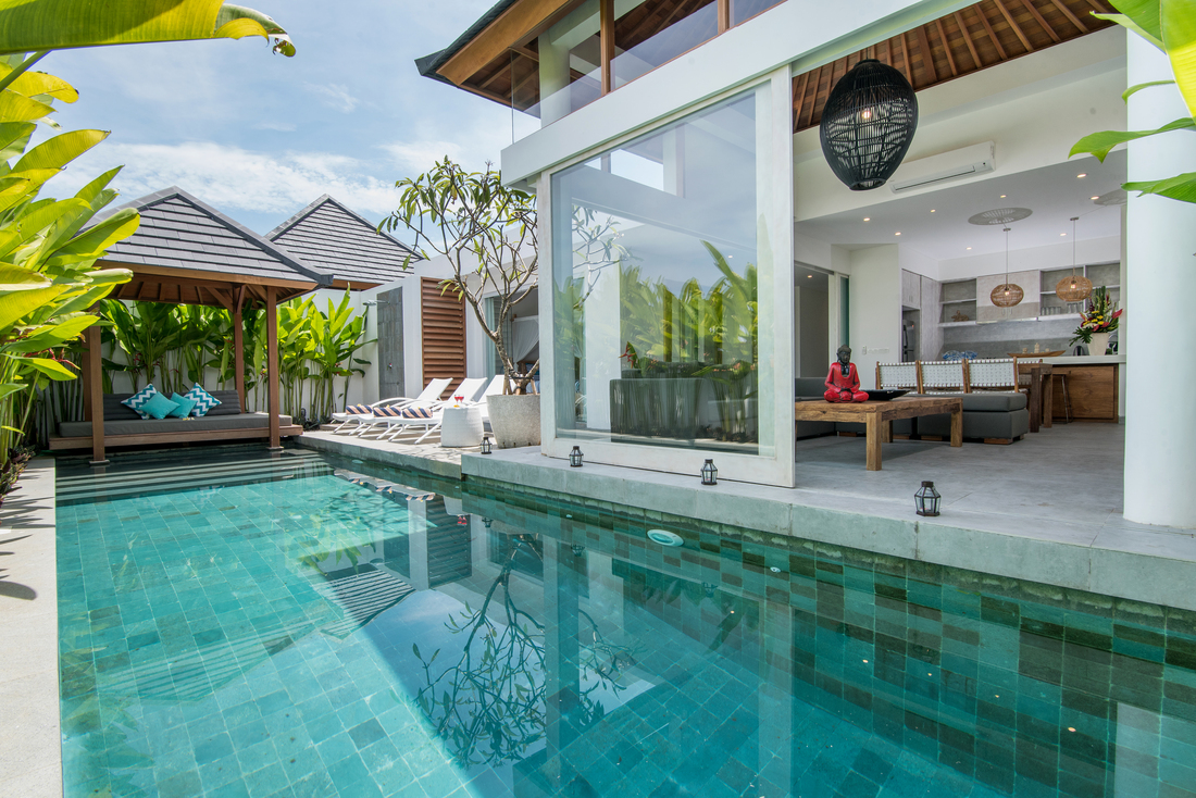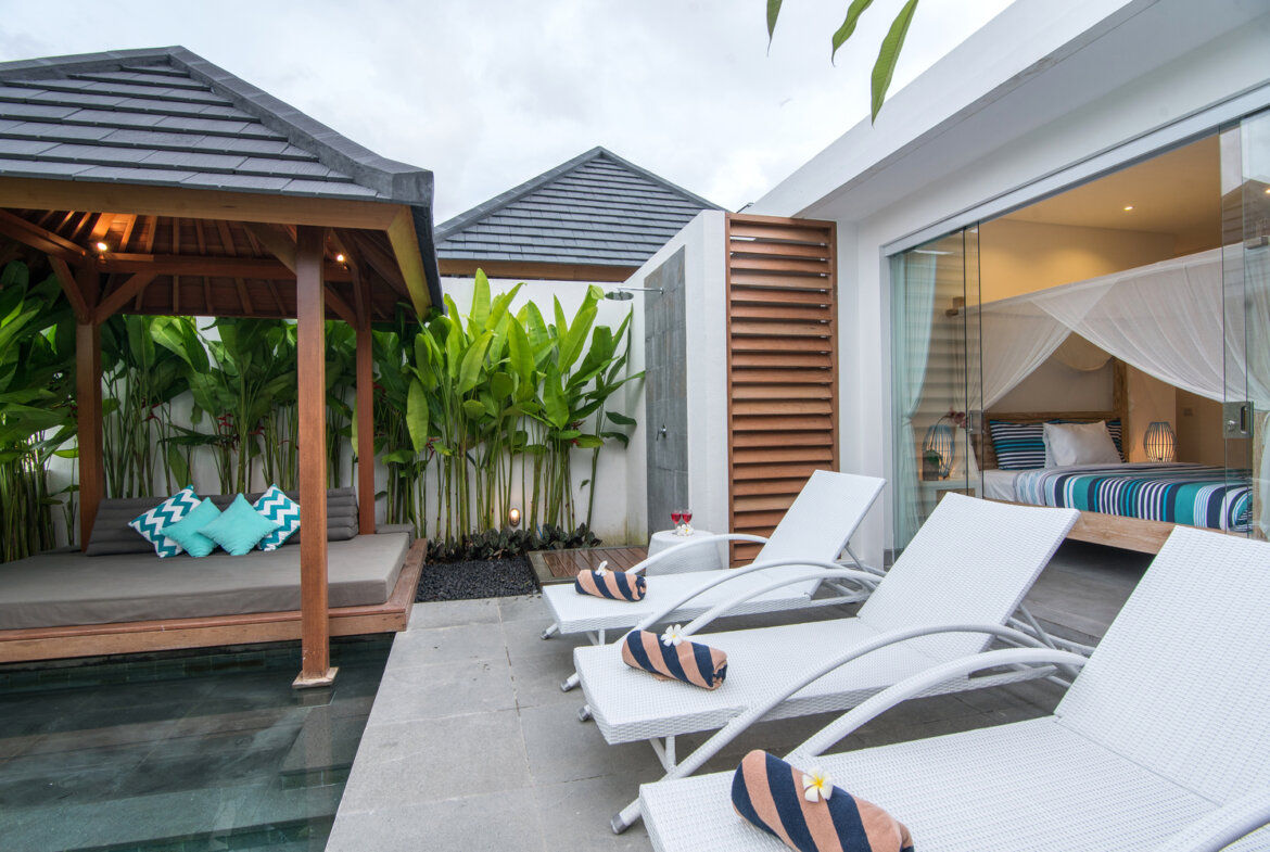 The outdoor area includes a private swimming pool surrounded by greenery, creating a serene space to relax and enjoy Bali’s tropical lifestyle.