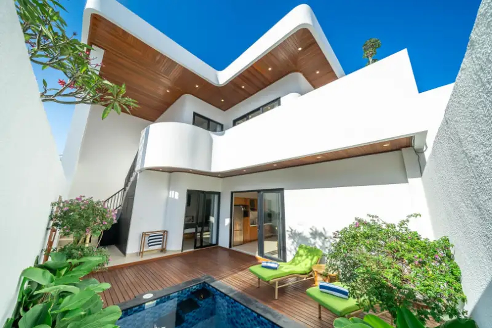 Step inside to find an open-concept living and dining area with seamless indoor-outdoor flow. The fully equipped modern kitchen boasts premium appliances and elegant wooden cabinetry. Each of the five spacious bedrooms is designed for relaxation, with floor-to-ceiling glass doors opening to a private pool and lush garden views.