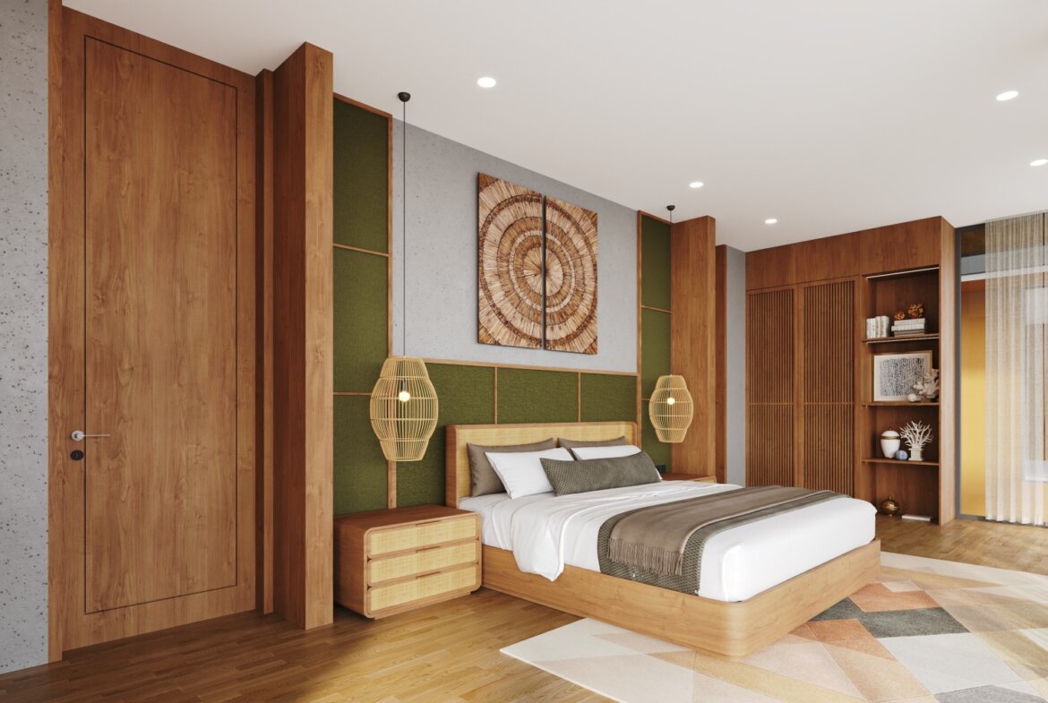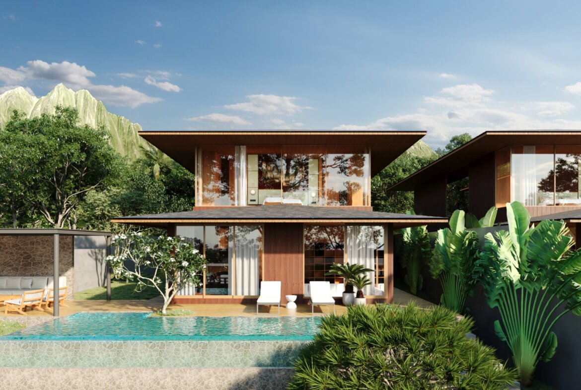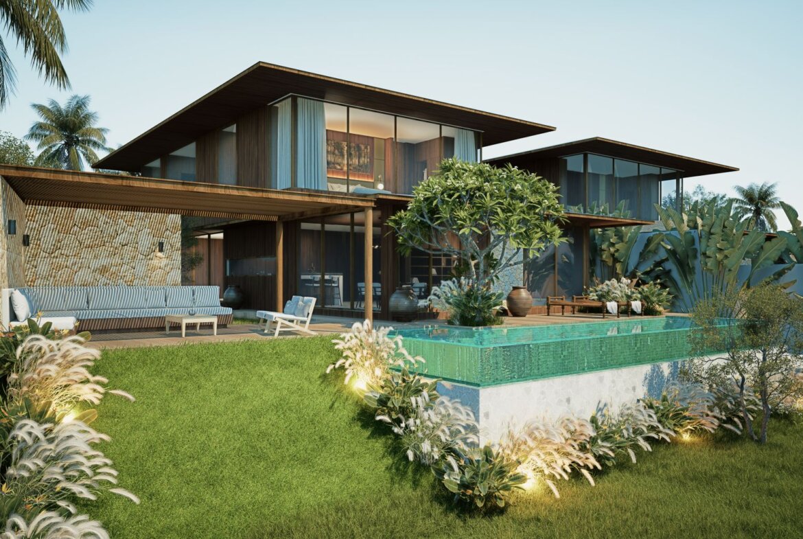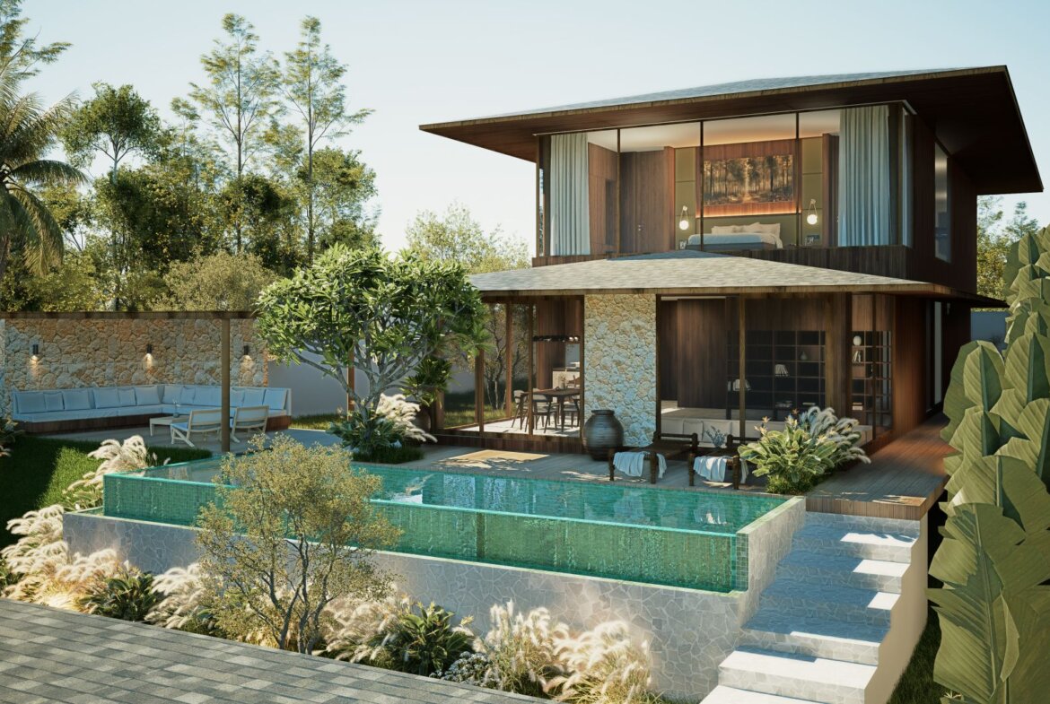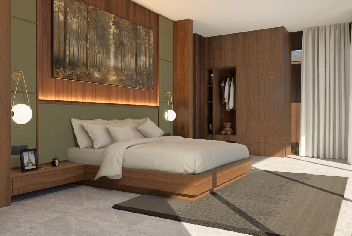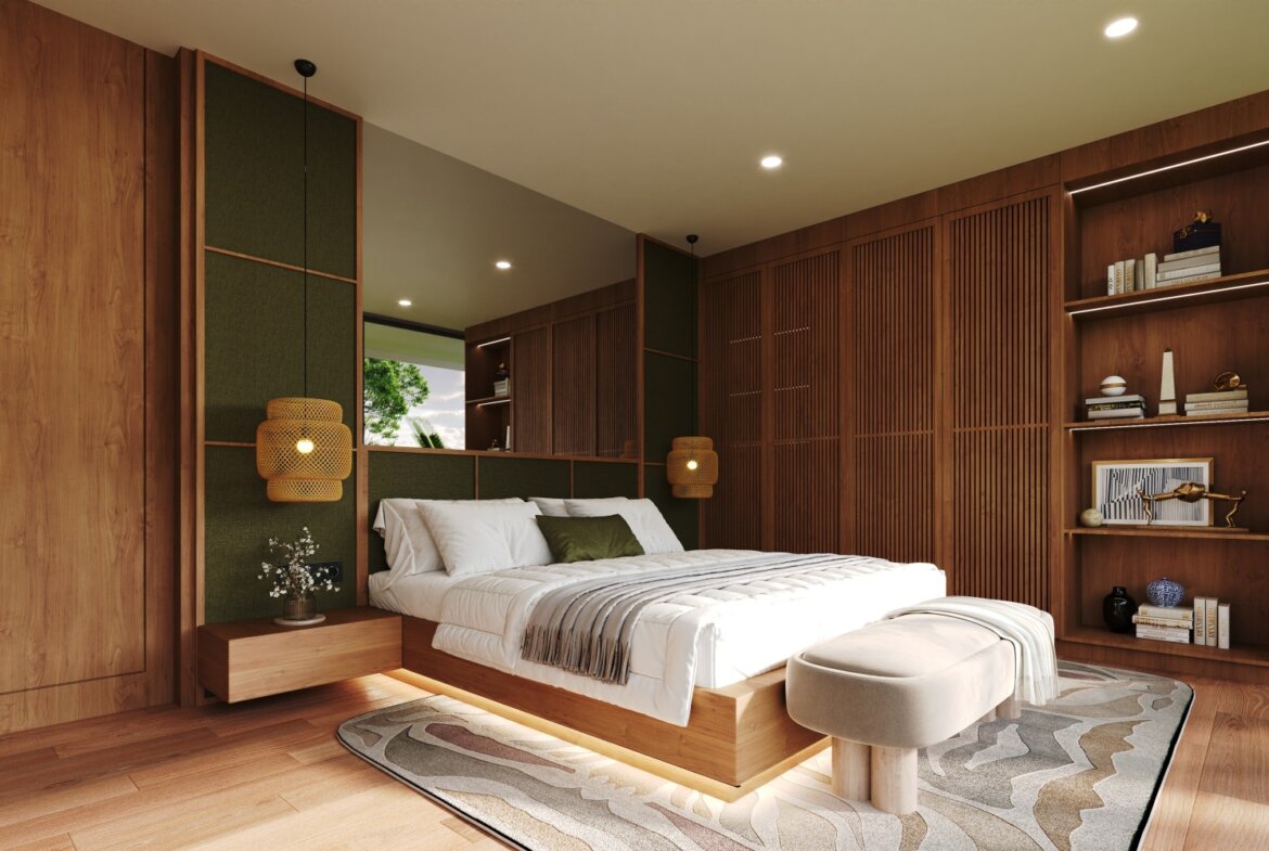 The villa features spacious open-plan living areas, a sleek modern kitchen, and floor-to-ceiling windows that invite abundant natural light and provide serene views of the lush surroundings. Each bedroom is thoughtfully designed with warm wooden accents, ample storage, and ensuite bathrooms for ultimate privacy and convenience.