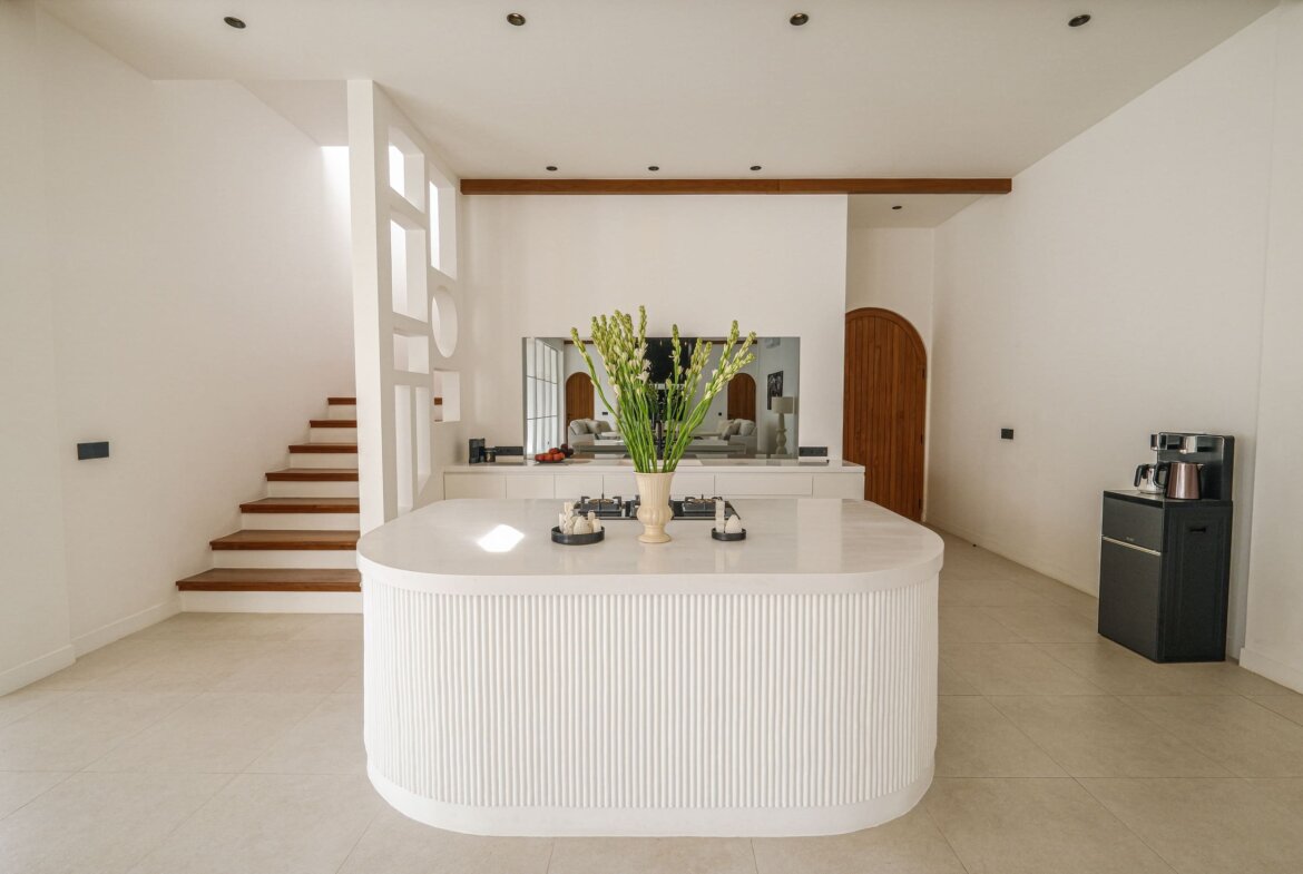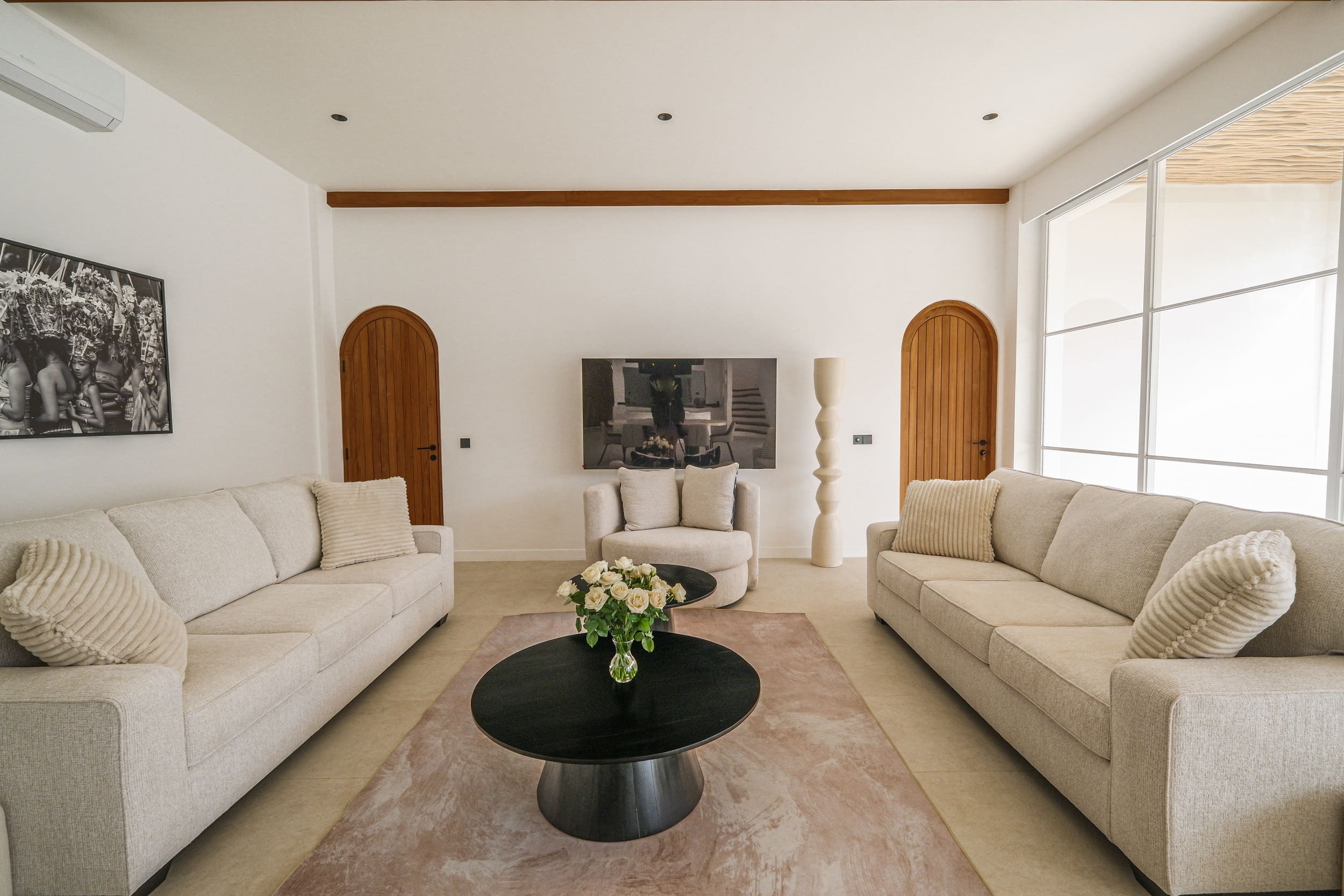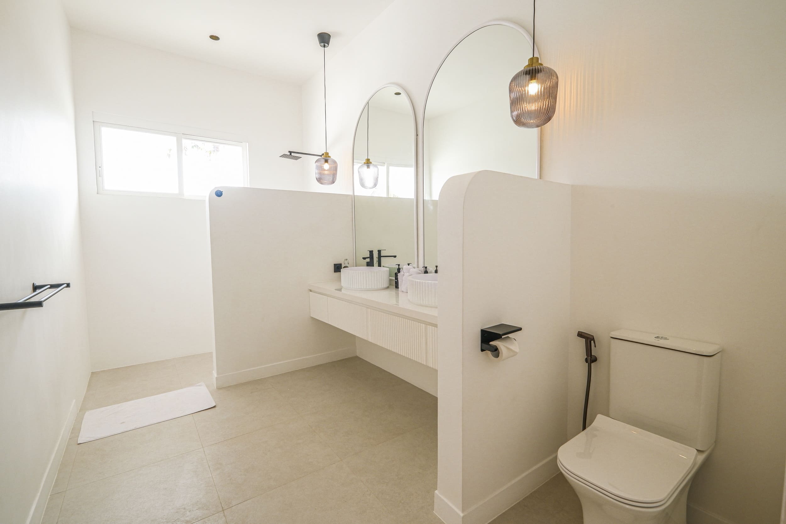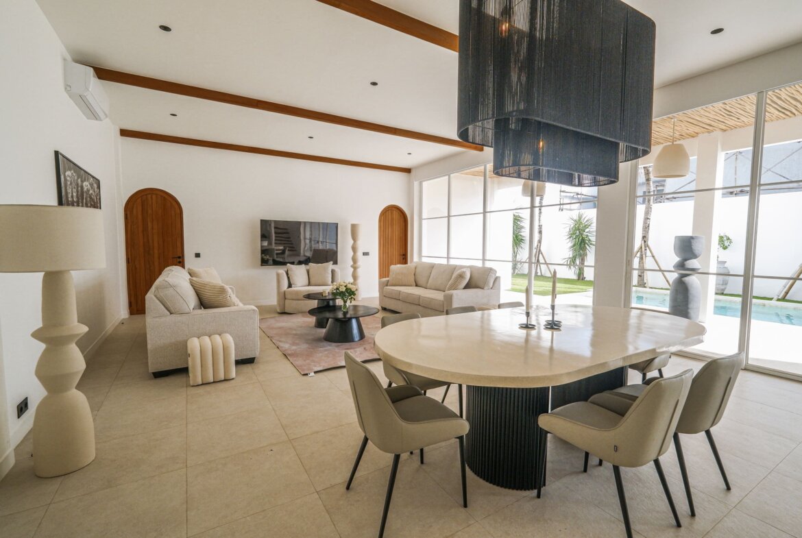 Built on 450 sqm of land with 500 sqm of well-designed living space, the villa offers four generously sized bedrooms, each with its own en-suite bathroom. An open-plan living and dining area connected to a modern kitchen. A versatile bonus room adds extra functionality — perfect for a home office, gym, or family lounge. Outdoors, a 12-meter swimming pool invites relaxation, surrounded by lush greenery and a private patio. The villa also features a laundry area, staff quarters, and covered parking for two vehicles.
