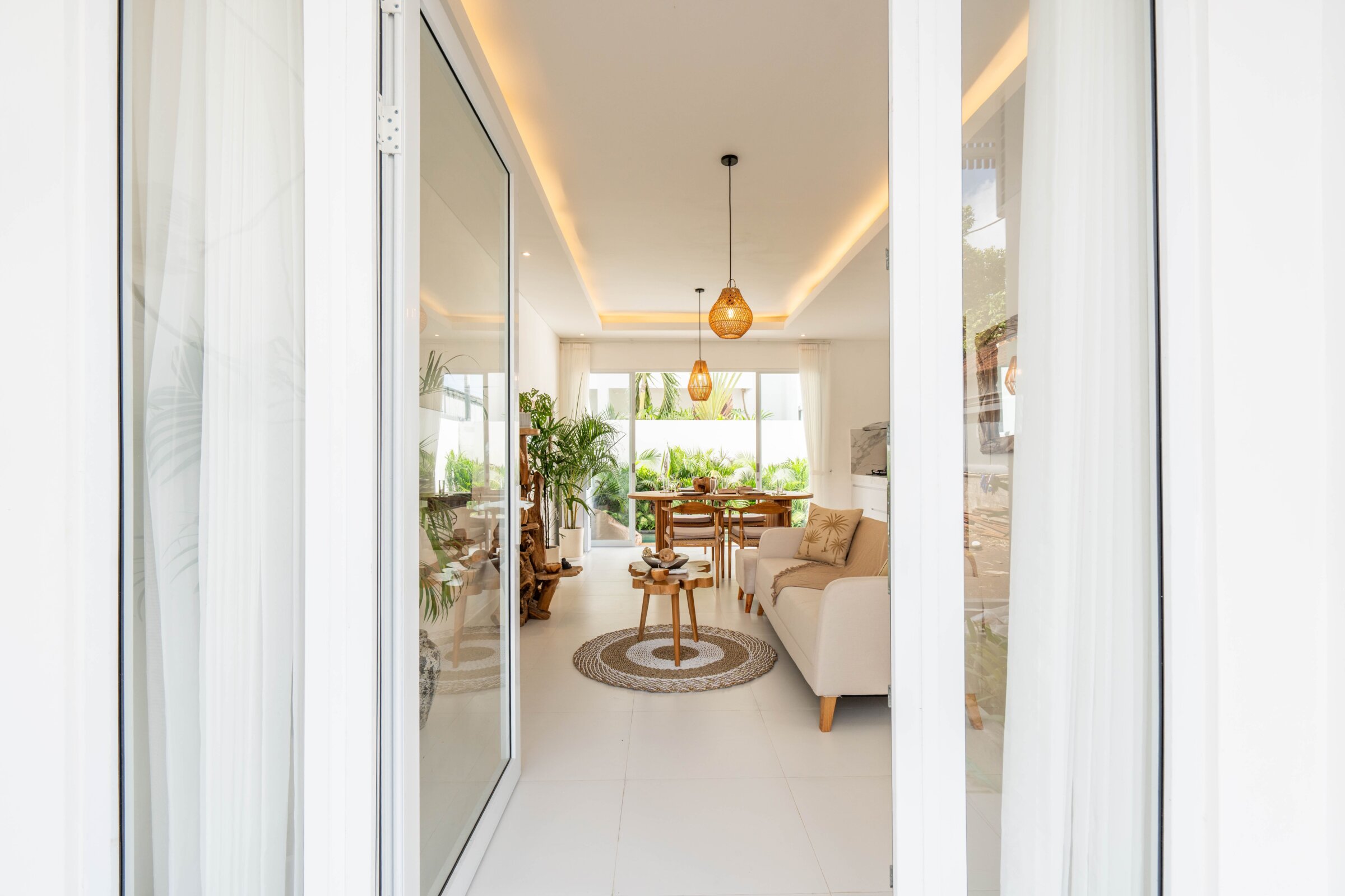 The villa features a private pool (12 sqm), a compact garden, and secure parking for cars and motorbikes. Interiors are bright and airy, with full-height tempered glass in the living room and second-floor bedrooms, allowing natural light to flood the space and offering seamless views of the pool and garden. High ceilings, wooden accents, and greenery create a stylish yet grounded atmosphere.