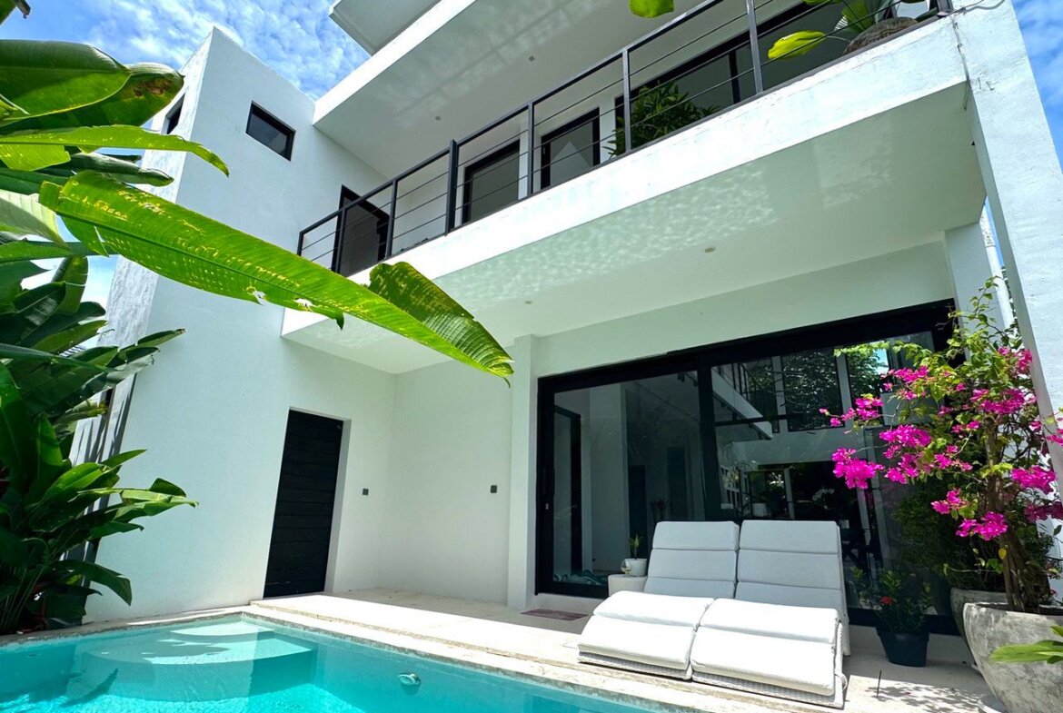 Set on 2.8 are of land under a 23-year leasehold title in a yellow zone (with extension potential), the villa features a generous 280 m² of refined living space, complemented by an impressive 100 m² rooftop terrace designed for elevated outdoor living. Clean architectural lines, a crisp white façade, and expansive glass panels define the exterior, allowing natural light to flood the interiors while seamlessly blending indoor and outdoor spaces.