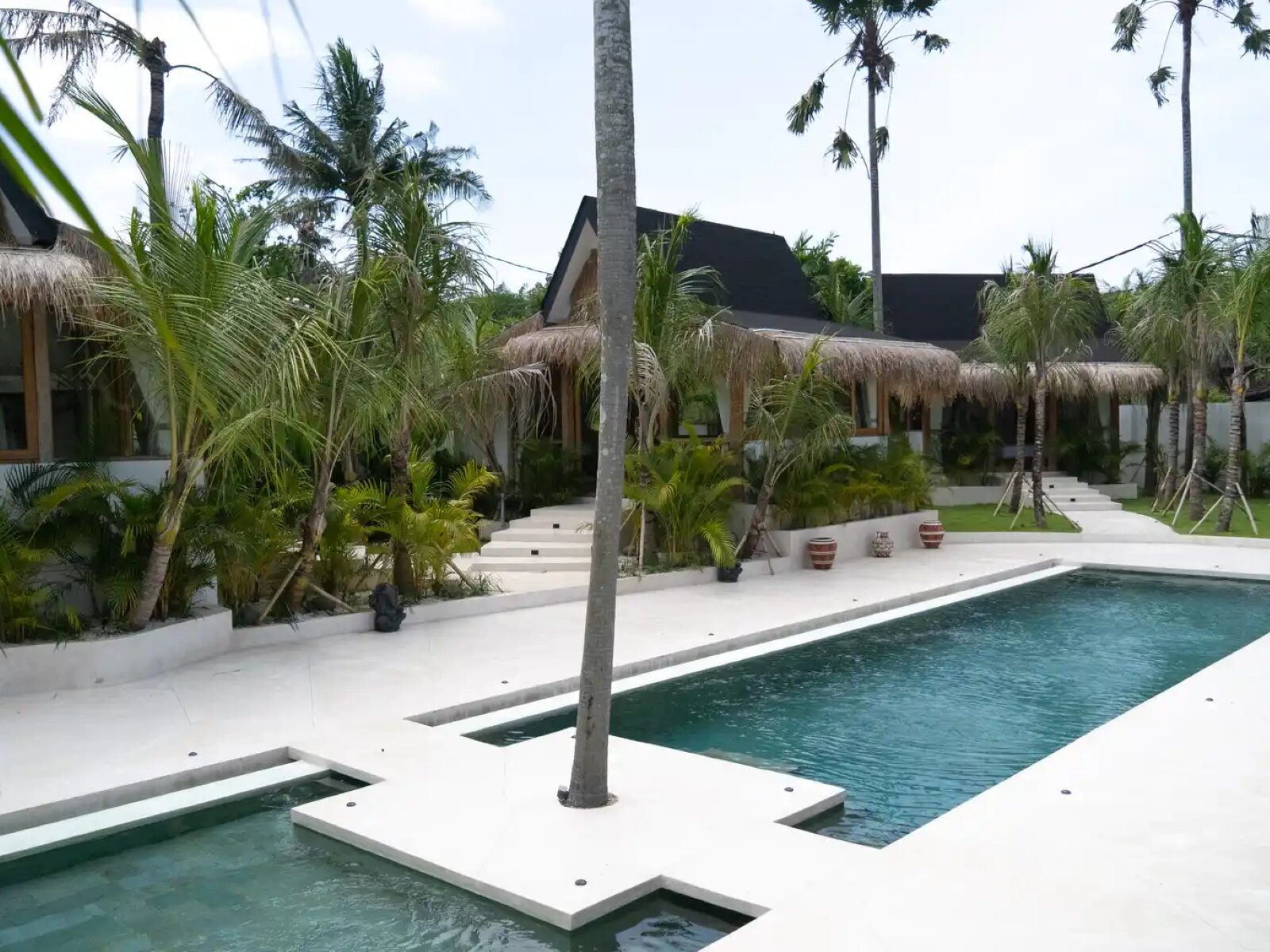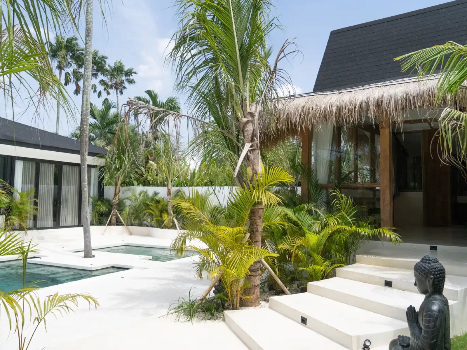 The villa features 4 spacious bedrooms, each with its own ensuite bathroom, offering comfort and privacy. Designed in a distinctive Modern Tropical Pavilion style, the property is composed of separate pavilion blocks arranged around a central swimming pool, creating a resort-like atmosphere while enhancing natural airflow and privacy. Traditional alang-alang thatched roofs soften the contemporary architecture and provide natural insulation, adding warmth and character to the design.