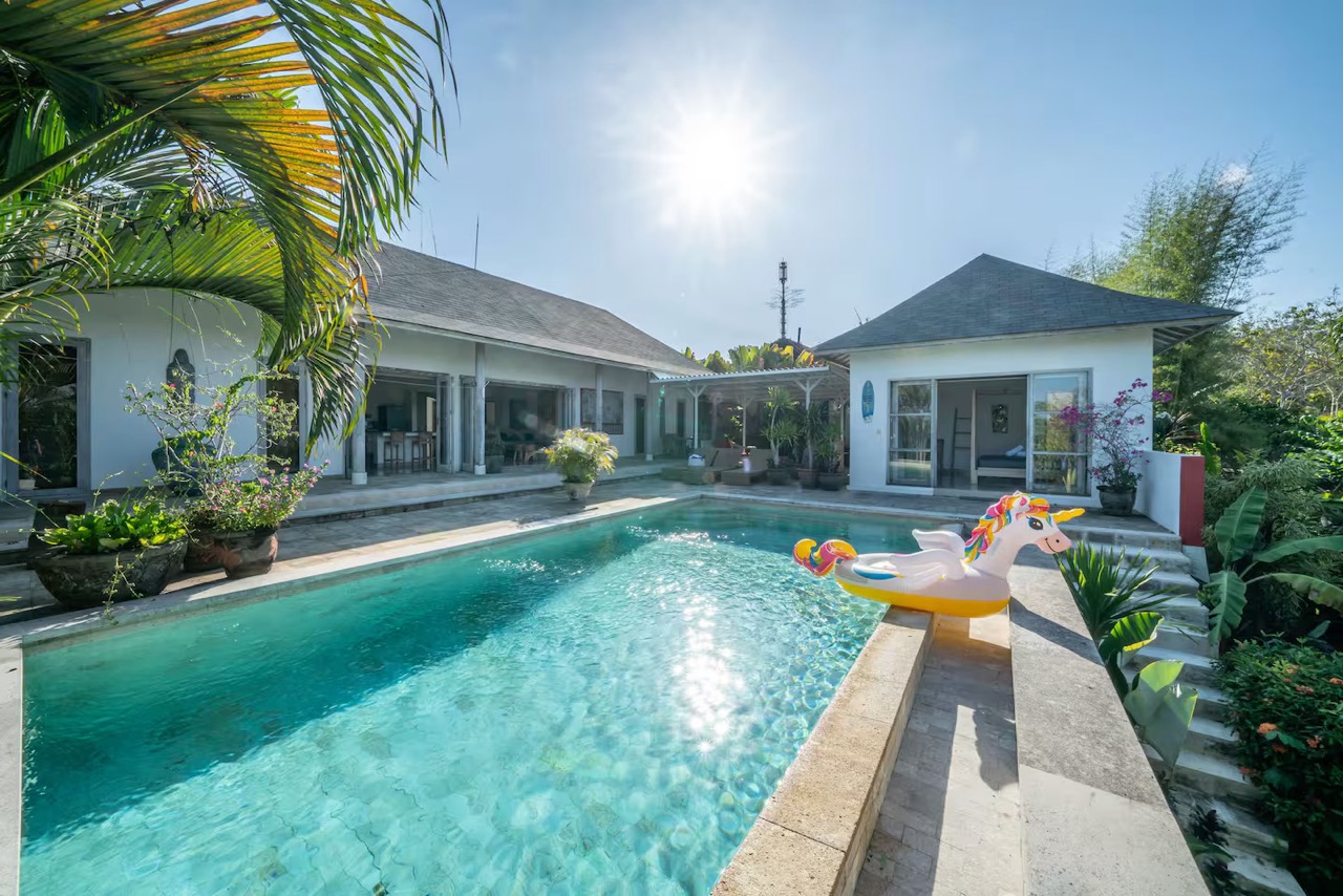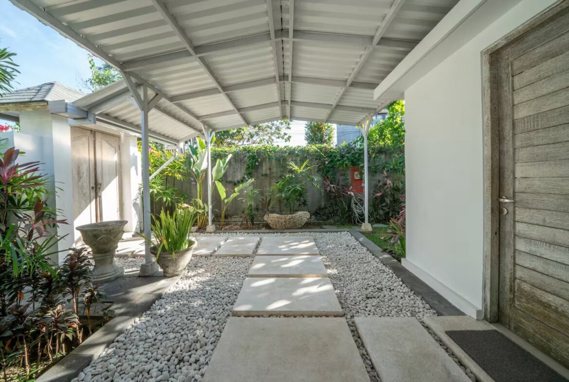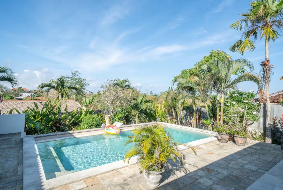 Step outside into a lush tropical garden filled with palm trees, frangipani flowers, and exotic plants. The outdoor area is designed for enjoyment, featuring a private swimming pool, sunbeds, alfresco dining area, and comfortable outdoor seating, perfect for entertaining guests or unwinding during Bali’s sunny days.