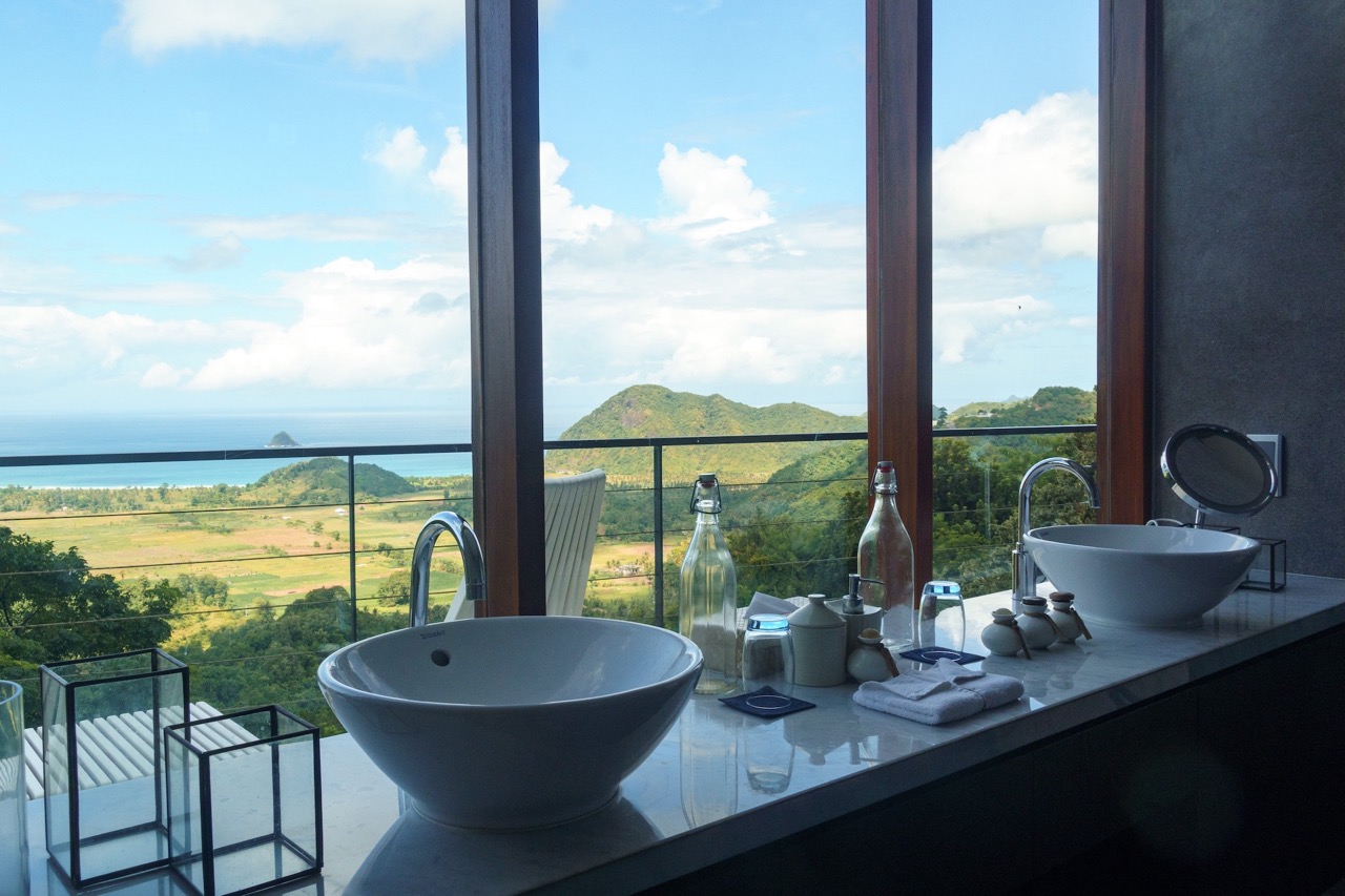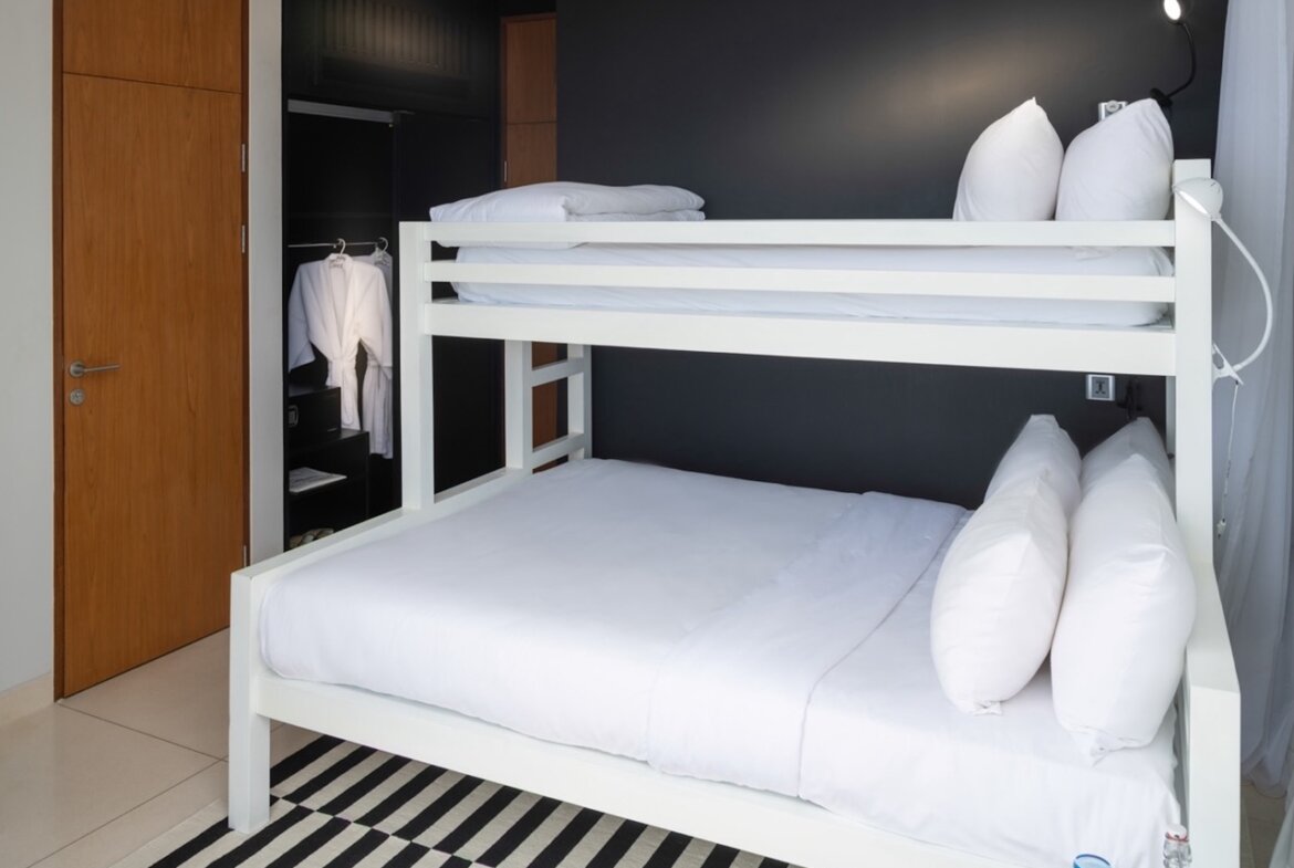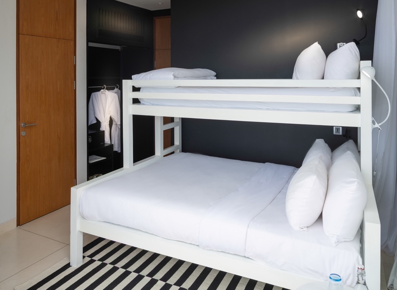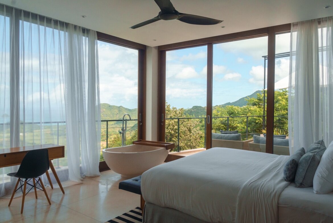 The spacious master suite boasts a bathtub with breathtaking views, while the second bedroom features bunk-style beds, making it ideal for children or additional guests. Expansive floor-to-ceiling windows flood the villa with natural light and perfectly frame the spectacular surroundings, creating an open and inviting atmosphere.