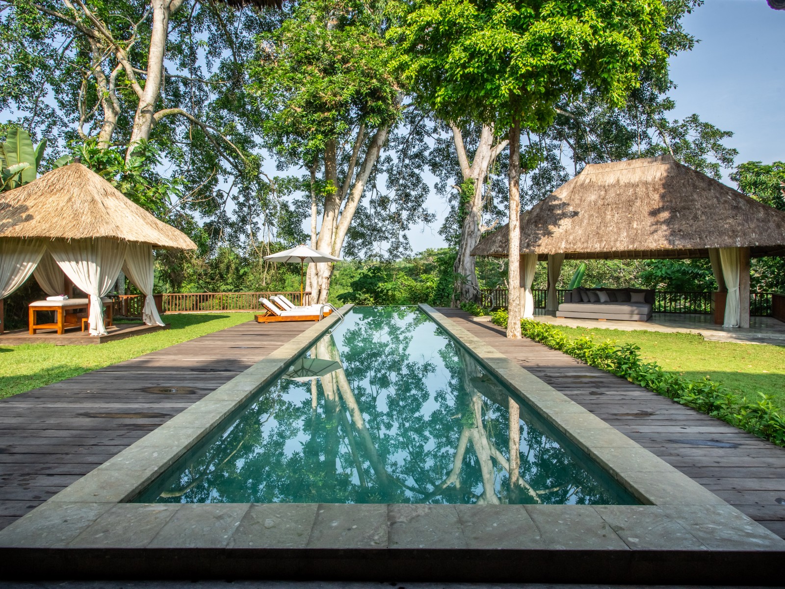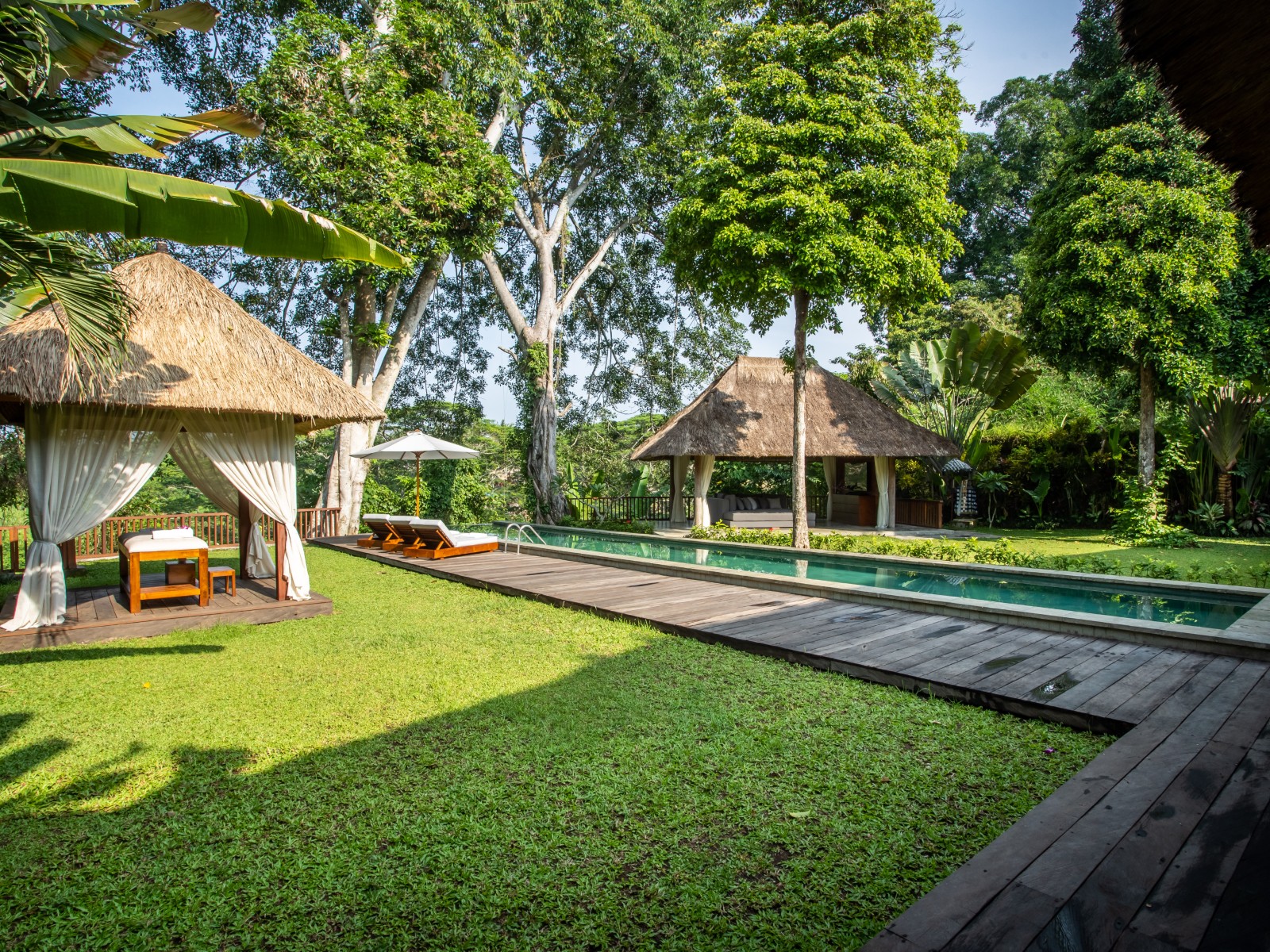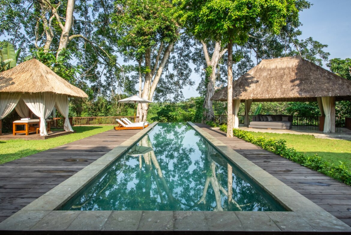 The outdoor area is designed to fully embrace its breathtaking natural surroundings, featuring a 20 meter stunning infinity swimming pool that overlooks the lush jungle landscape. At the heart of the pool, a beautifully set deck creates a unique space—perfect for enjoying breakfast in the morning light or unwinding with sunset drinks. Completing the experience is a dedicated massage area, offering a serene setting for relaxation and wellness amidst the tranquility of nature.