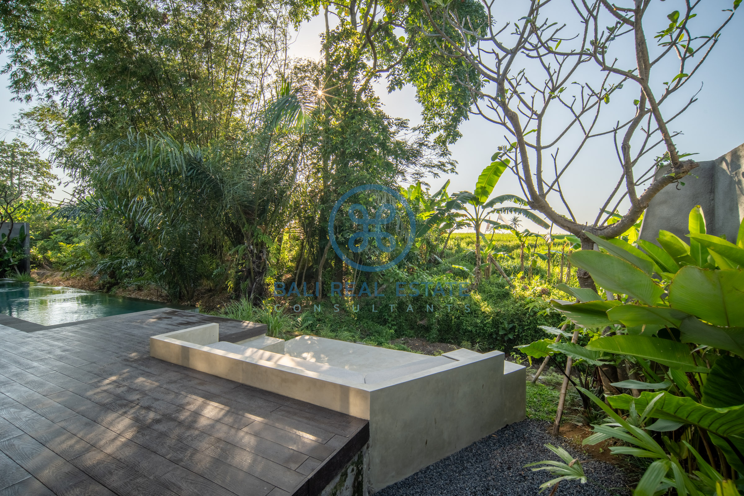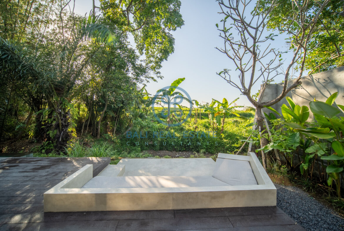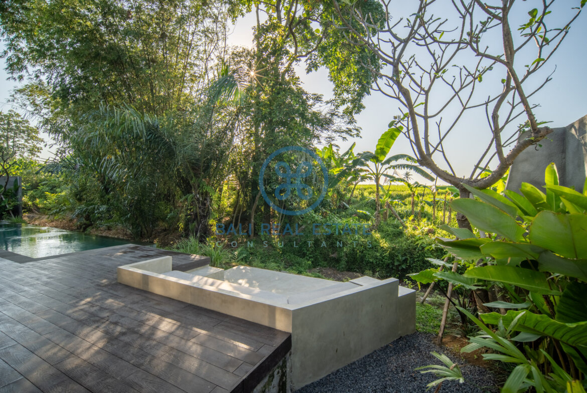 Step outside to a private swimming pool complemented by an inviting sunken deck and comfortable sun loungers, creating the perfect spot to unwind and soak up the tropical atmosphere. From here, enjoy uninterrupted views of the lush rice fields, offering a serene and picturesque backdrop that enhances the villa’s tranquil charm.