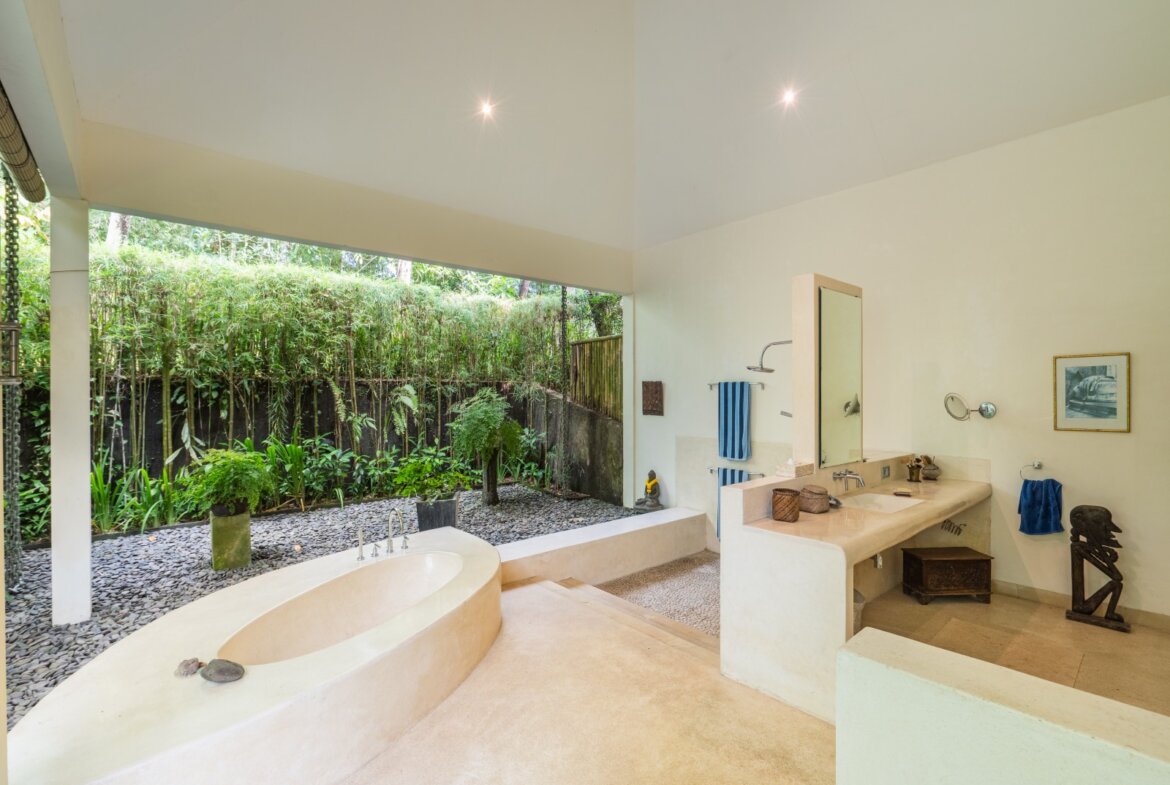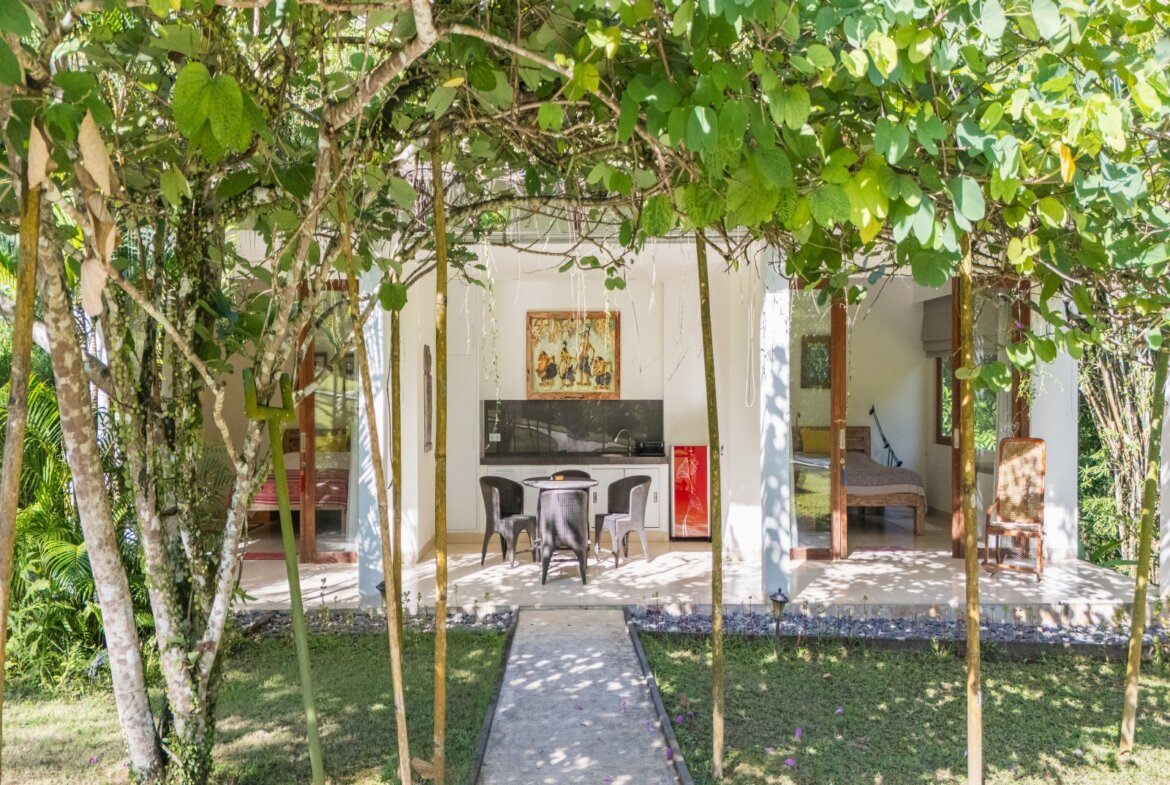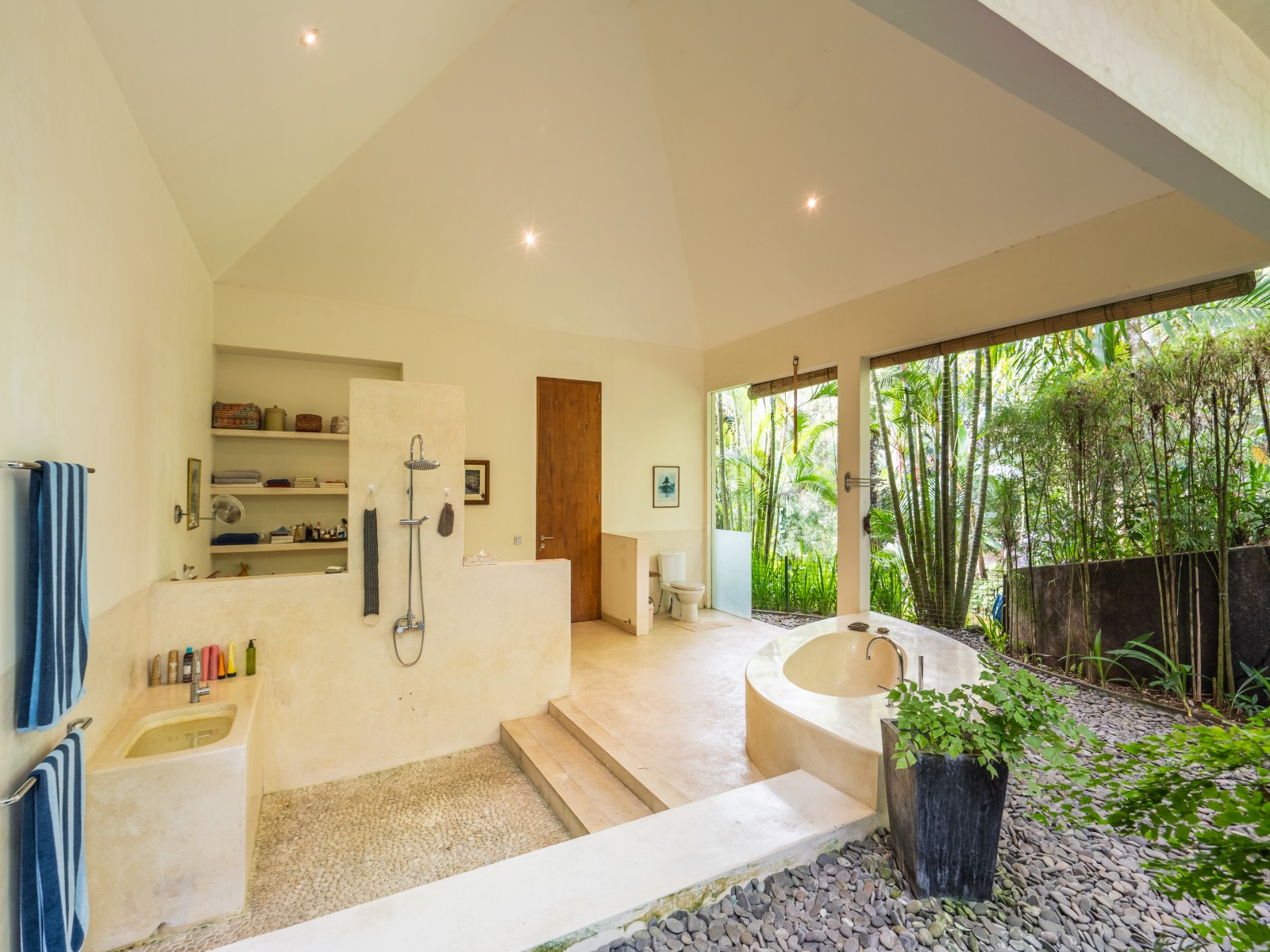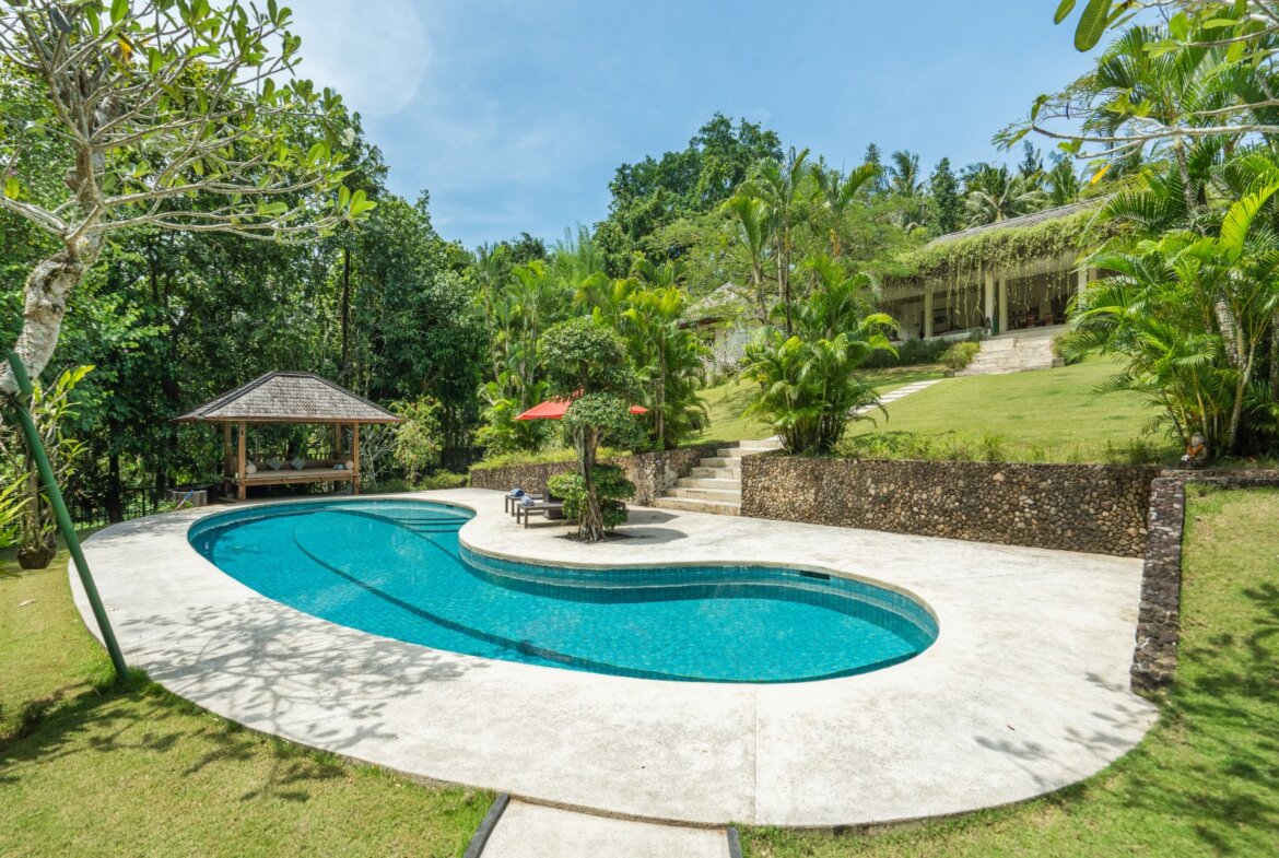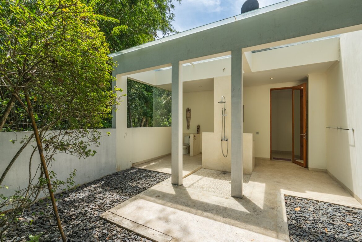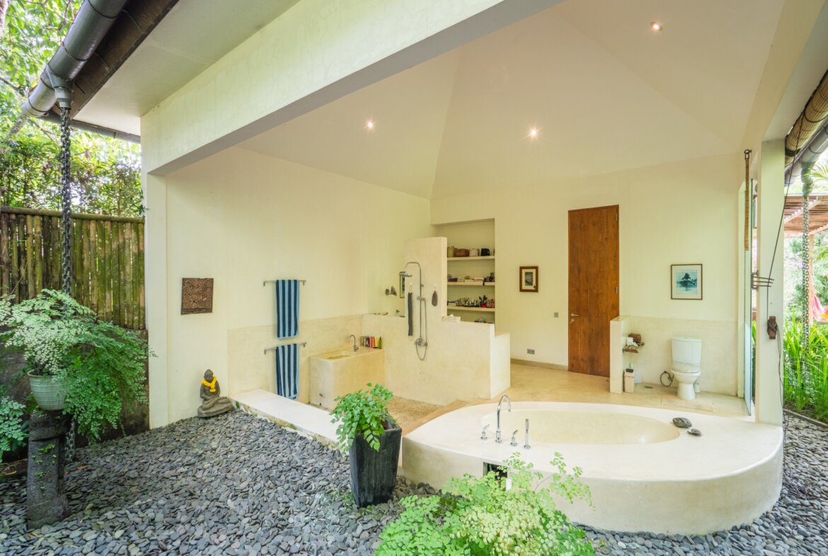 The outdoor space is highlighted by a white stone pathway that meanders through the lush garden, leading to a free-form pool encircled by a white stone deck. Here, the sunbeds and a bale bengong, a traditional gazebo, offering the perfect spot to unwind while enjoying views of the jungle and river.