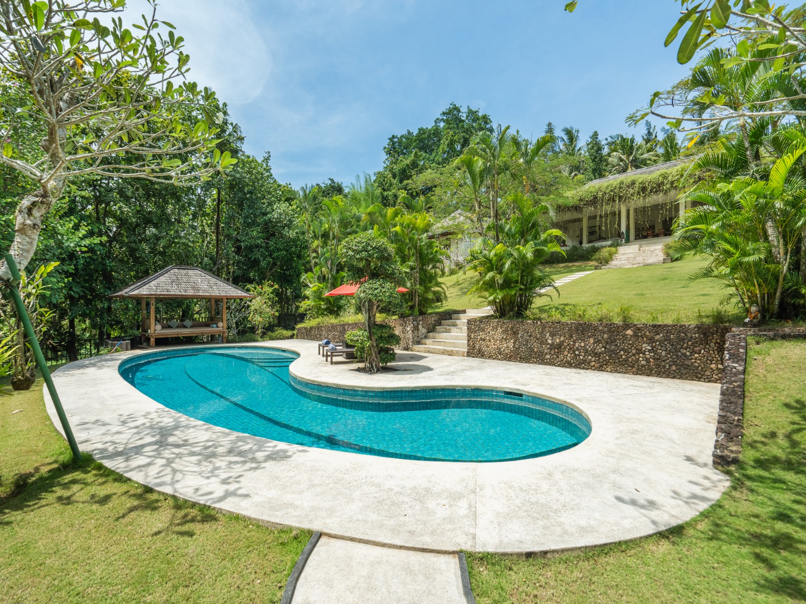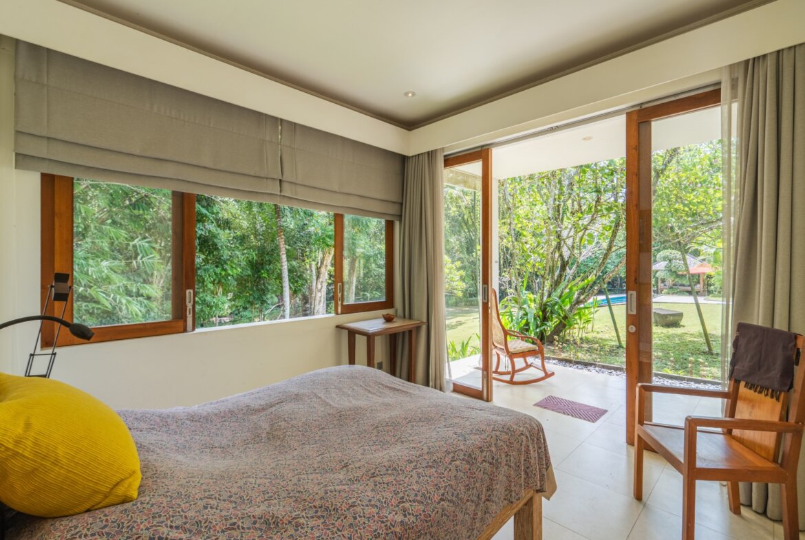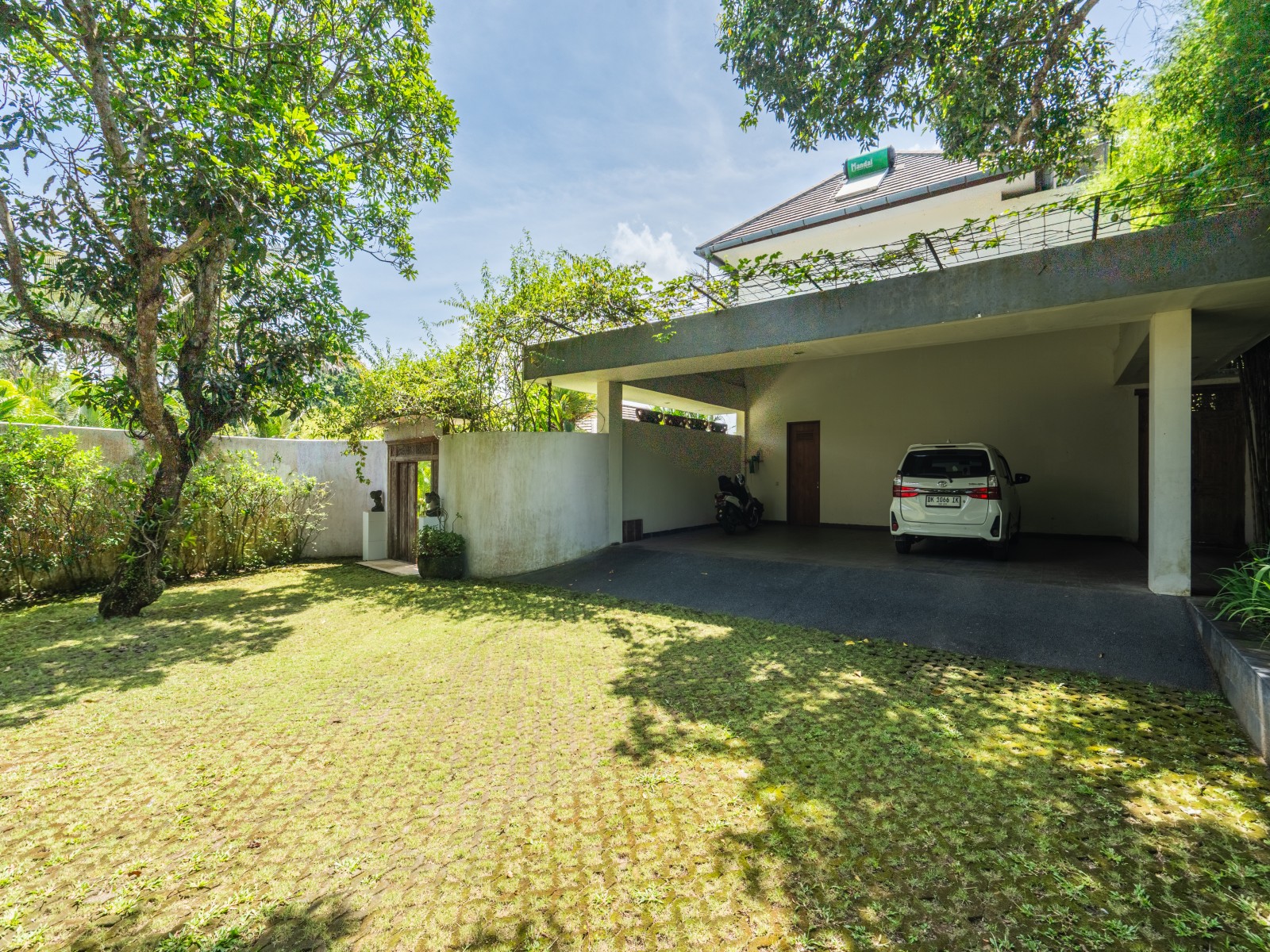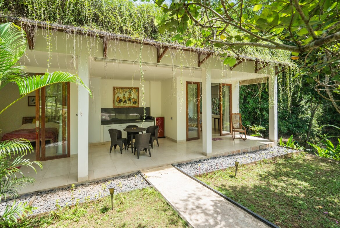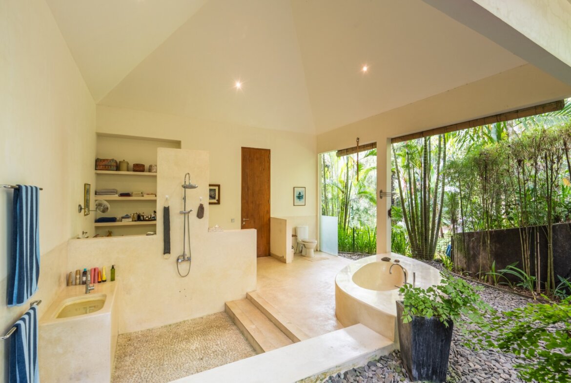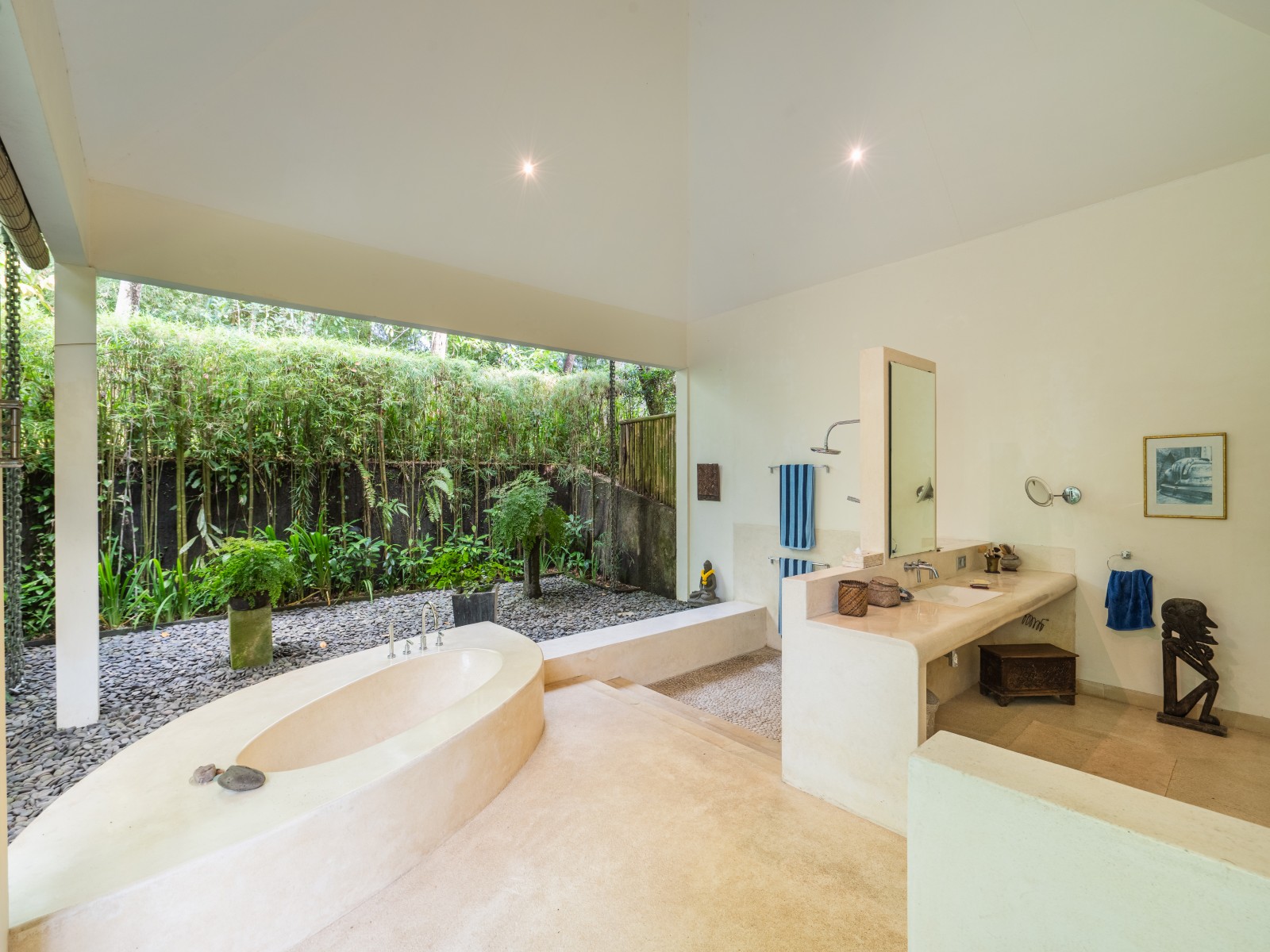 The outdoor space is highlighted by a white stone pathway that meanders through the lush garden, leading to a free-form pool encircled by a white stone deck. Here, the sunbeds and a bale bengong, a traditional gazebo, offering the perfect spot to unwind while enjoying views of the jungle and river.