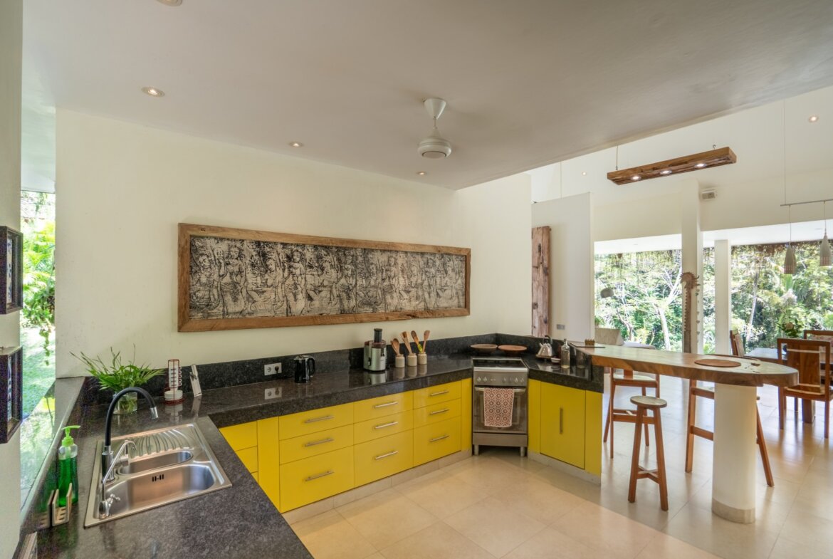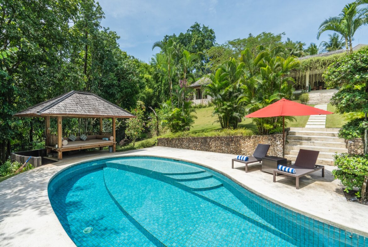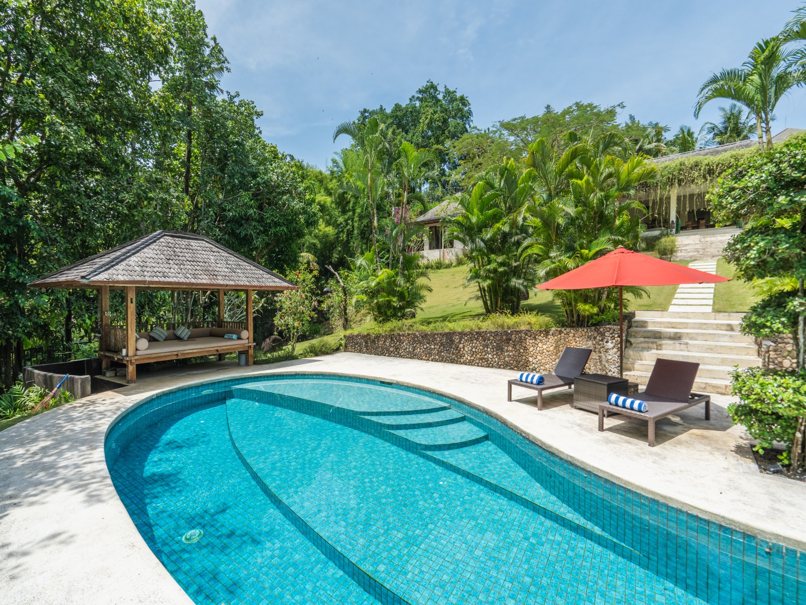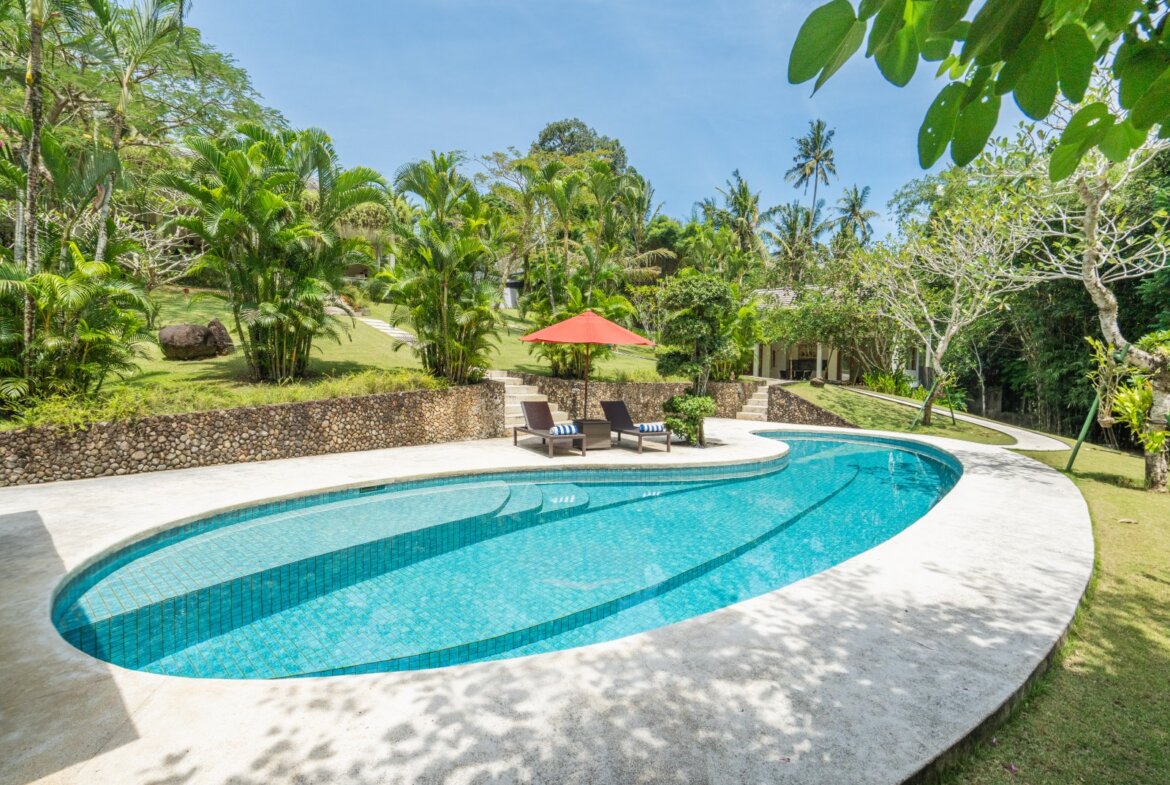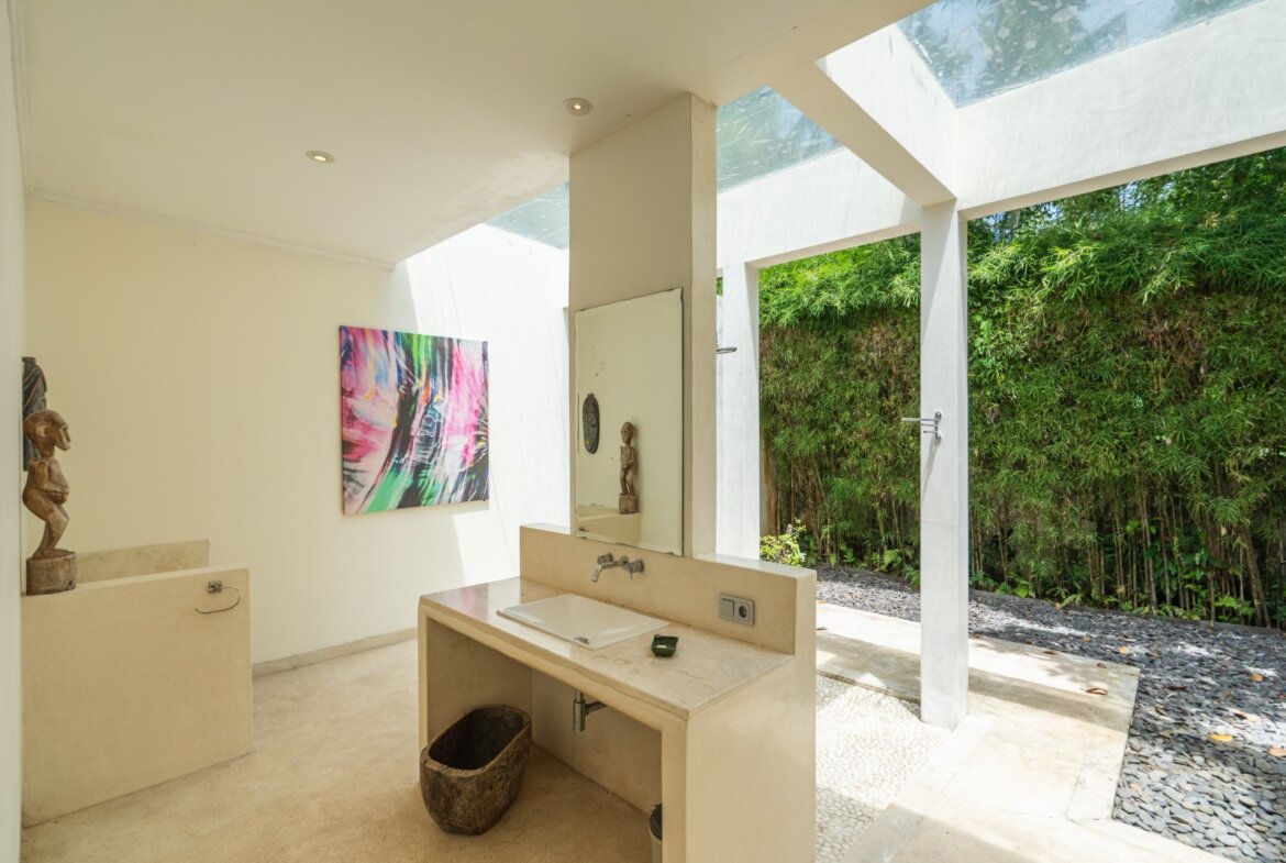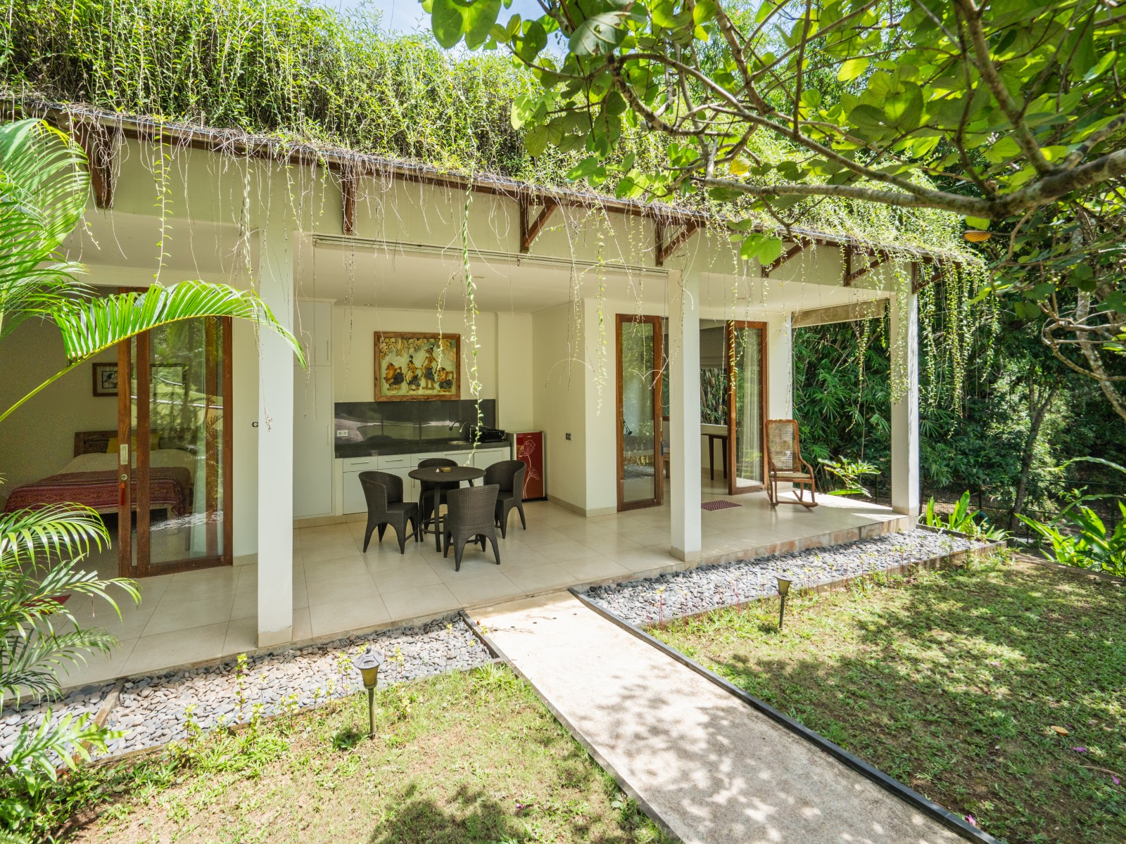 The outdoor space is highlighted by a white stone pathway that meanders through the lush garden, leading to a free-form pool encircled by a white stone deck. Here, the sunbeds and a bale bengong, a traditional gazebo, offering the perfect spot to unwind while enjoying views of the jungle and river.