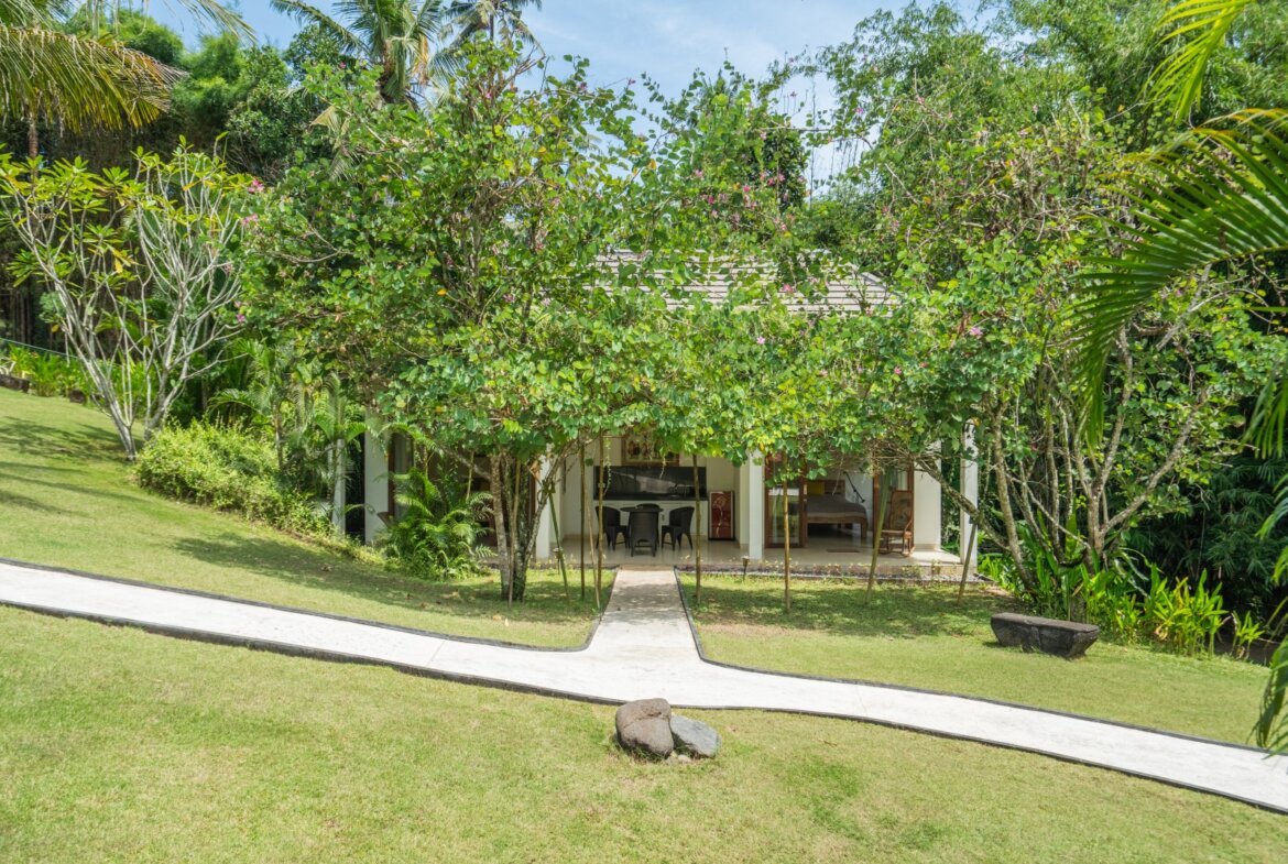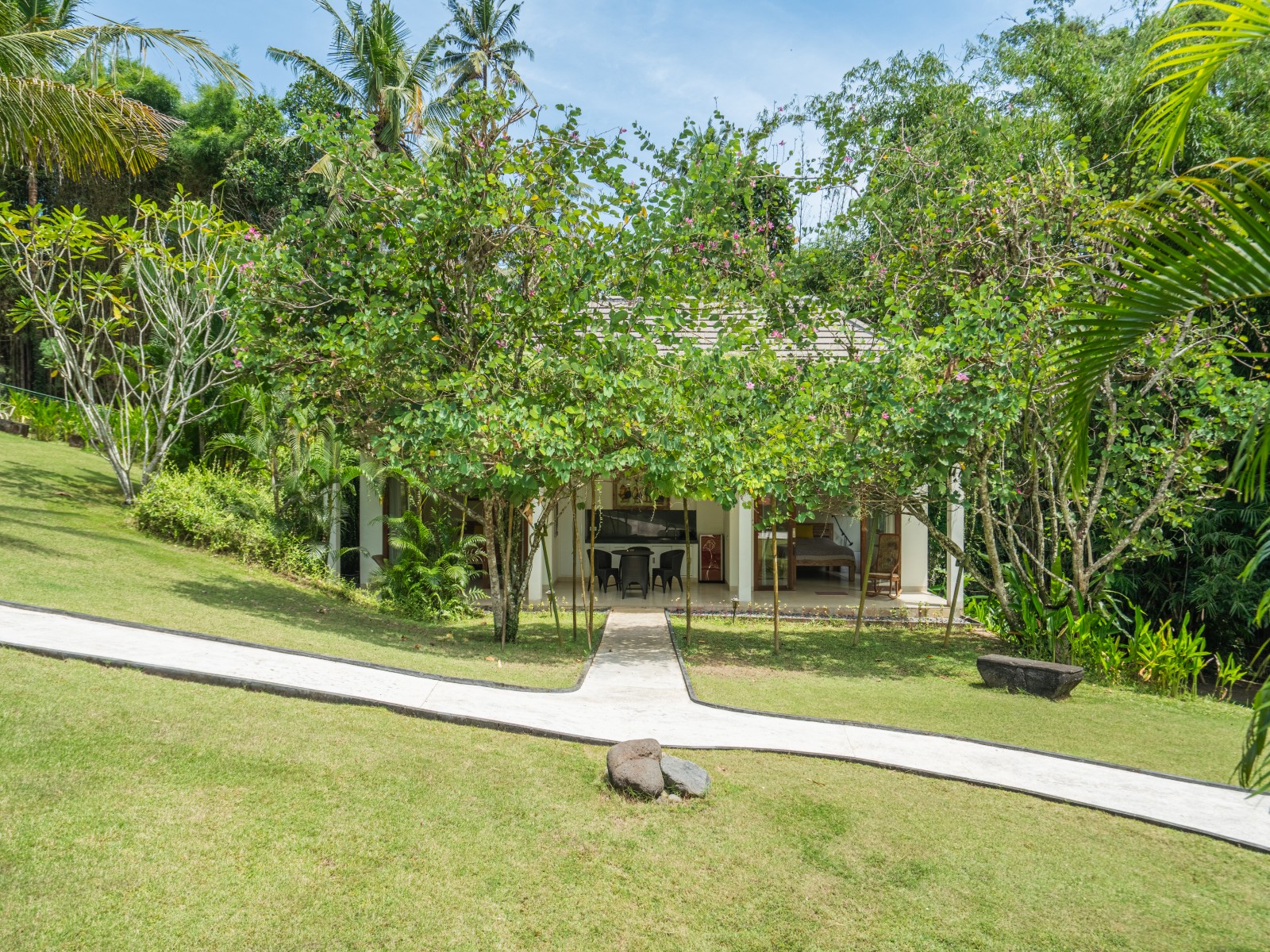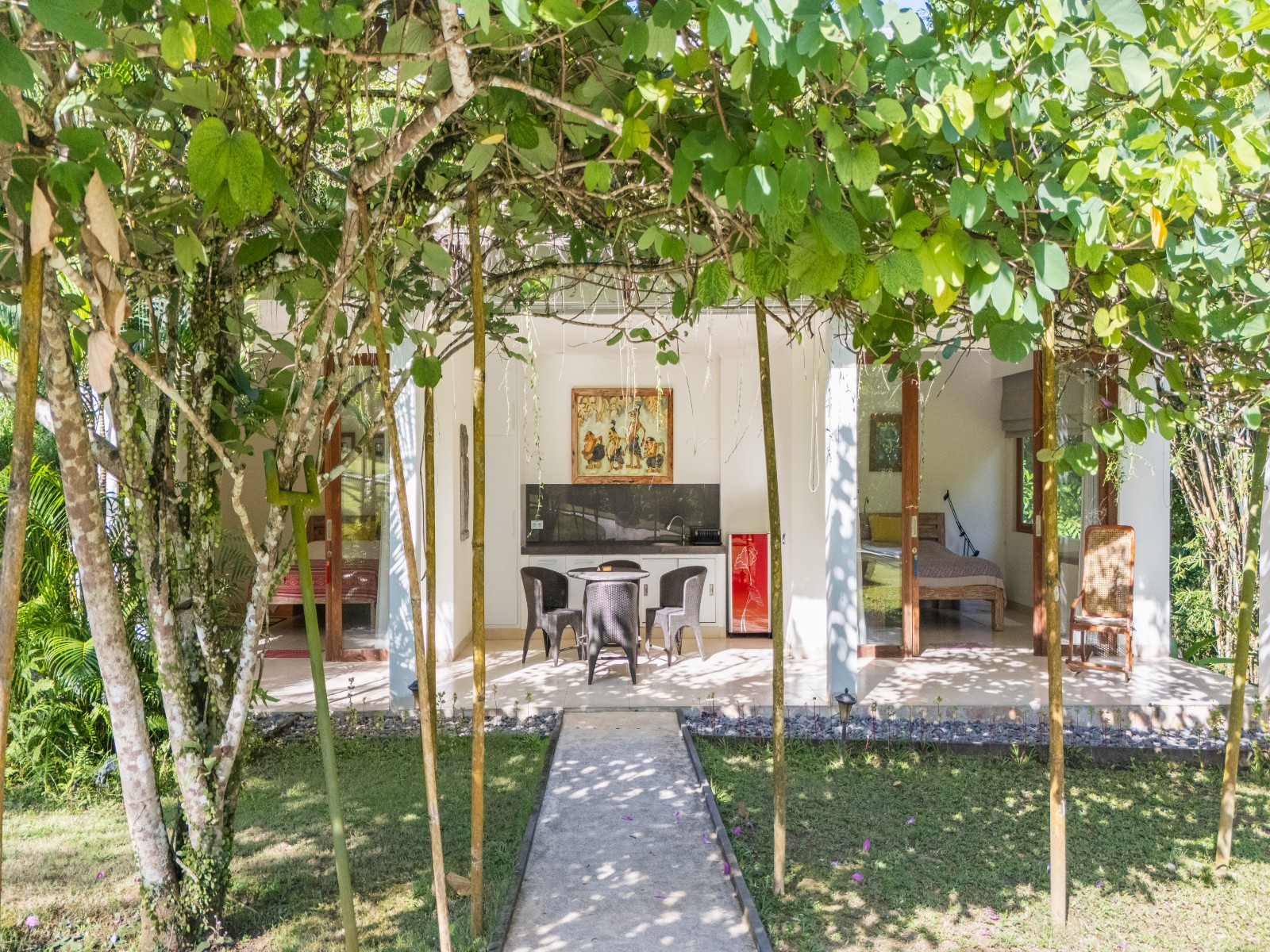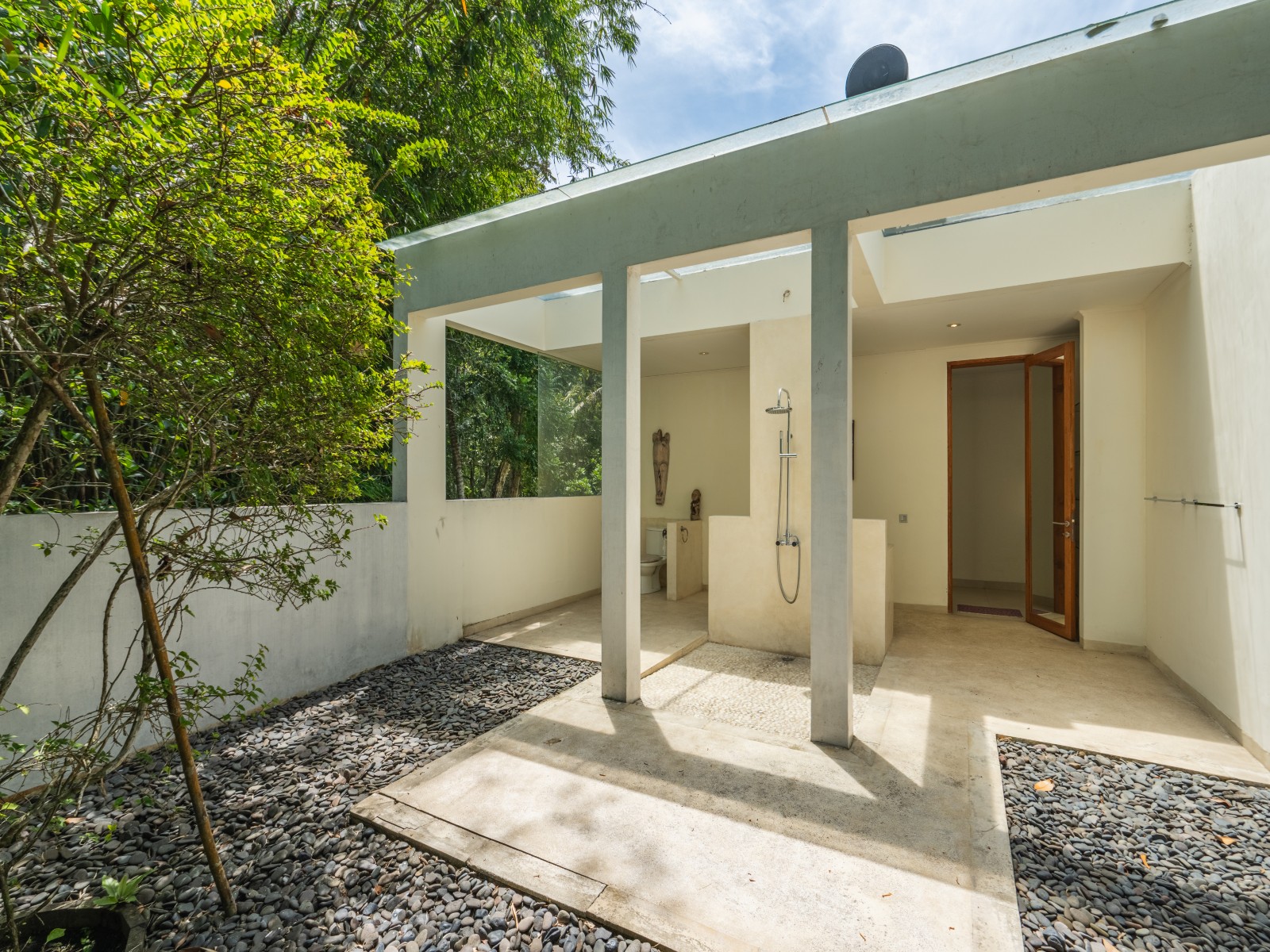The guest pavilion features 2 matching guest suites, each equipped with walk-in wardrobes and outdoor bathrooms with showers. A kitchenette and communal dining area sit between the suites, with charming pathways linking them to the main residence and leading down to the pool area.