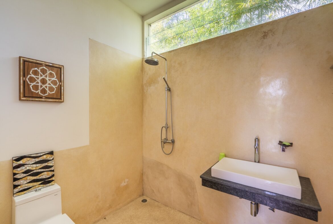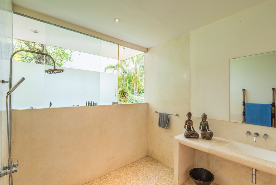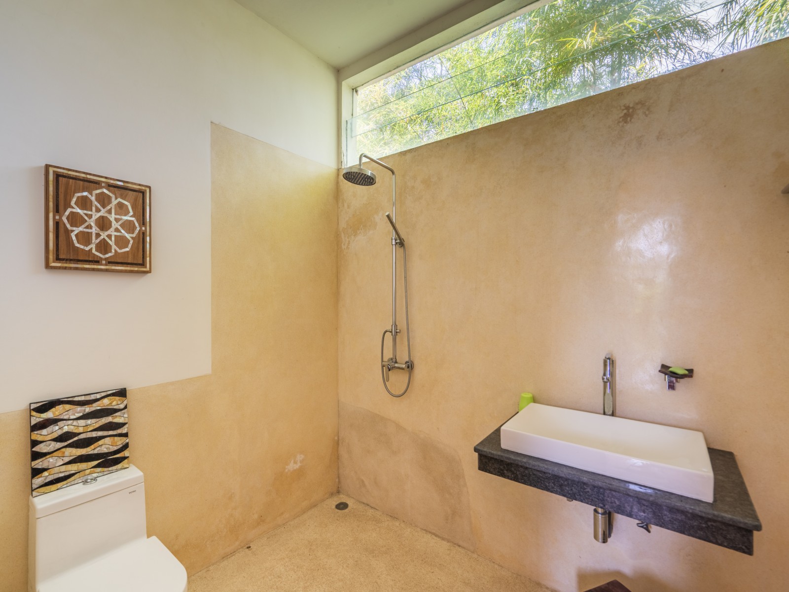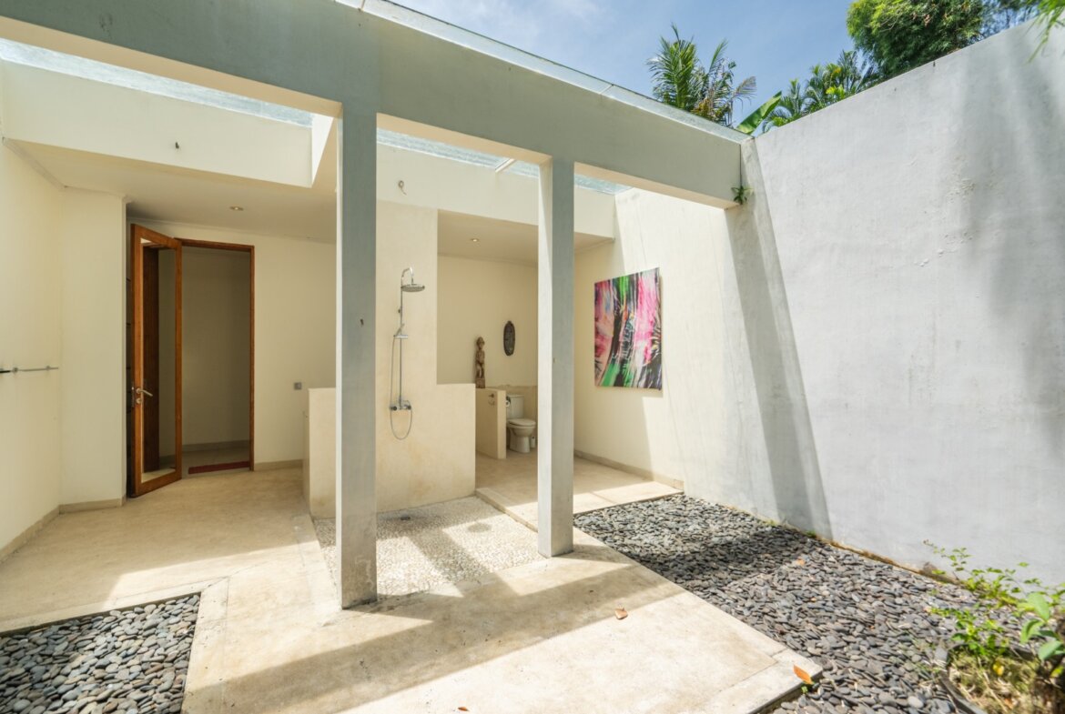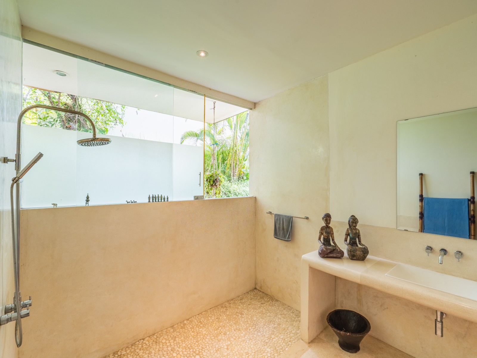 The guest pavilion features 2 matching guest suites, each equipped with walk-in wardrobes and outdoor bathrooms with showers. A kitchenette and communal dining area sit between the suites, with charming pathways linking them to the main residence and leading down to the pool area.