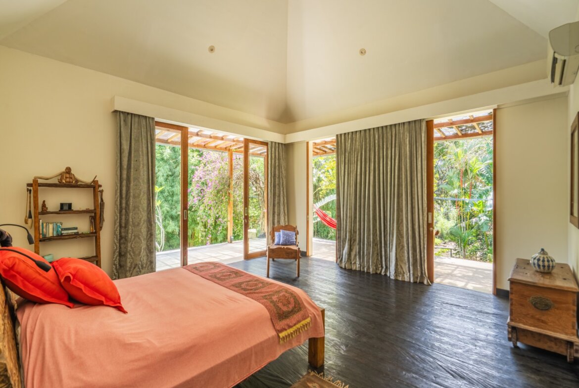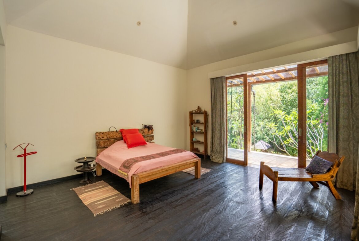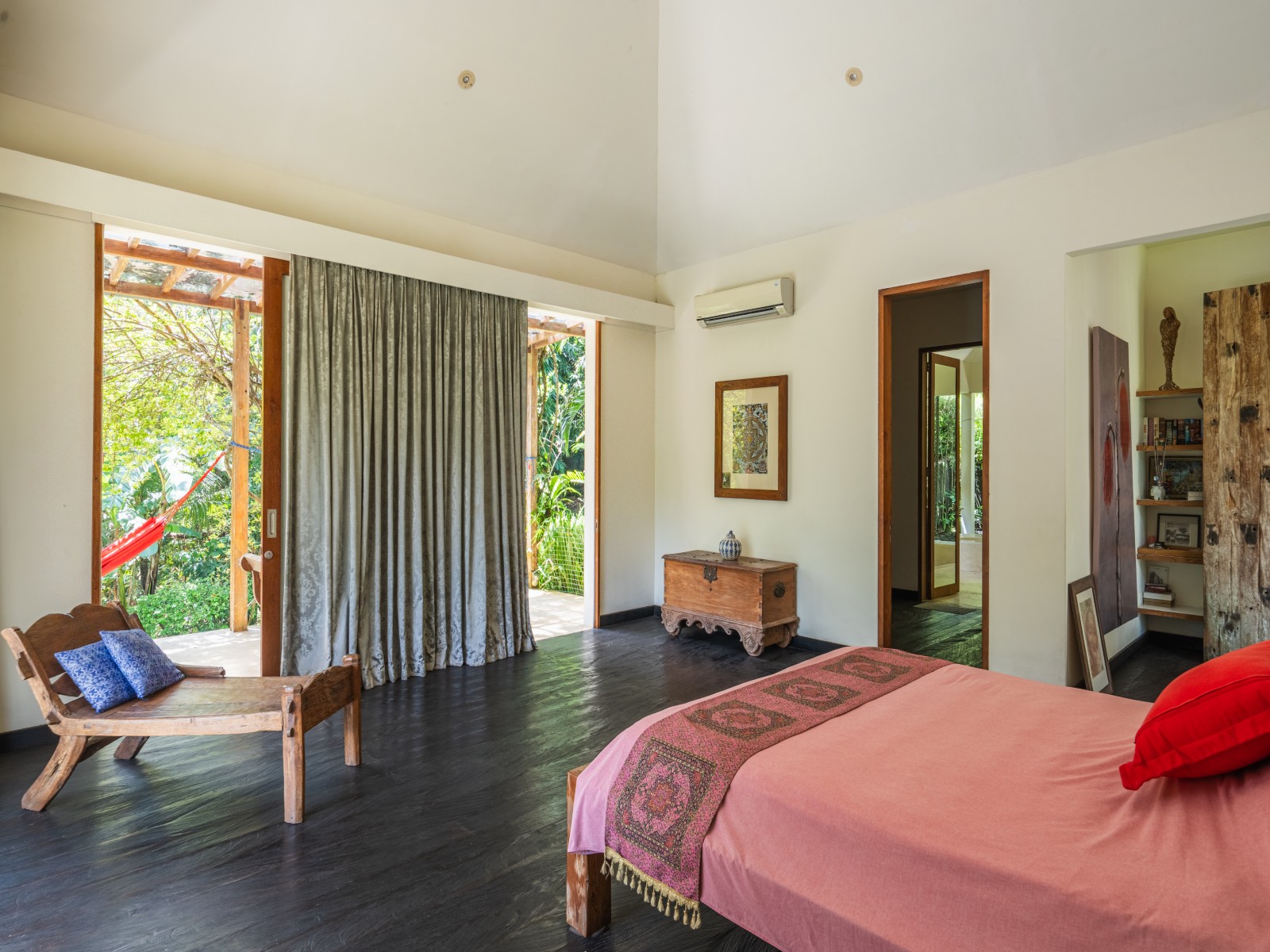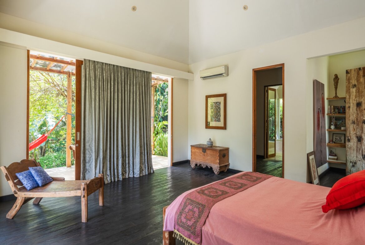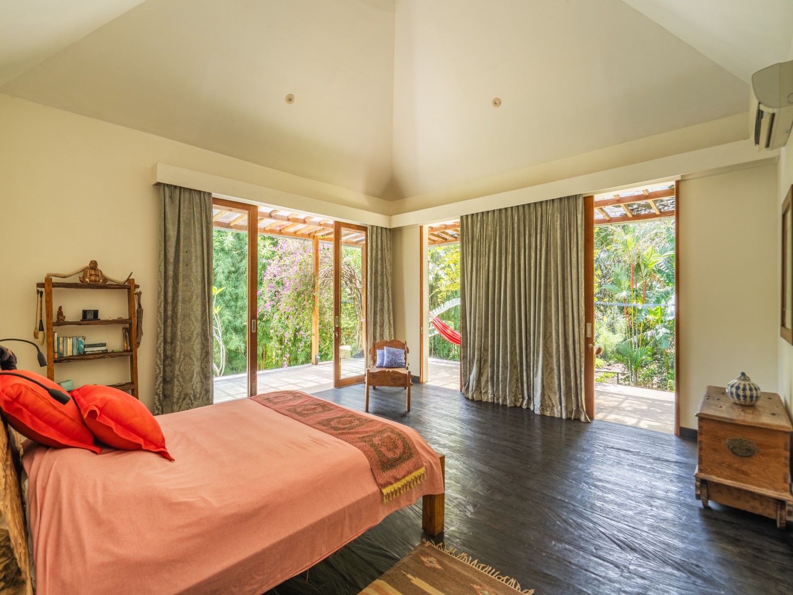 To the right of the main residence is the master bedroom pavilion, sheltered by a covered terrace on two sides, allowing for a seamless connection with the surrounding nature. The interior of the master suite showcases rich wooden flooring, a walk-in closet, and a generous open-plan bathroom complete with a built-in bathtub and separate shower.