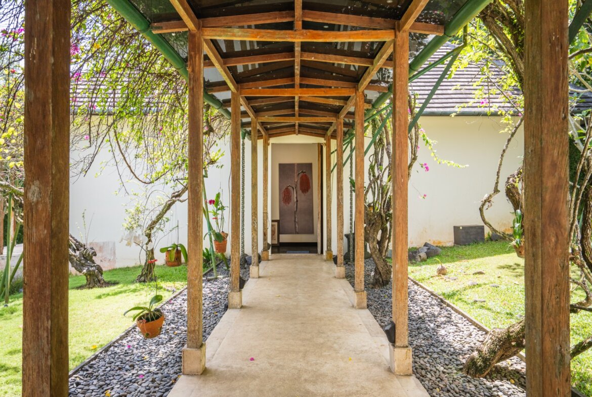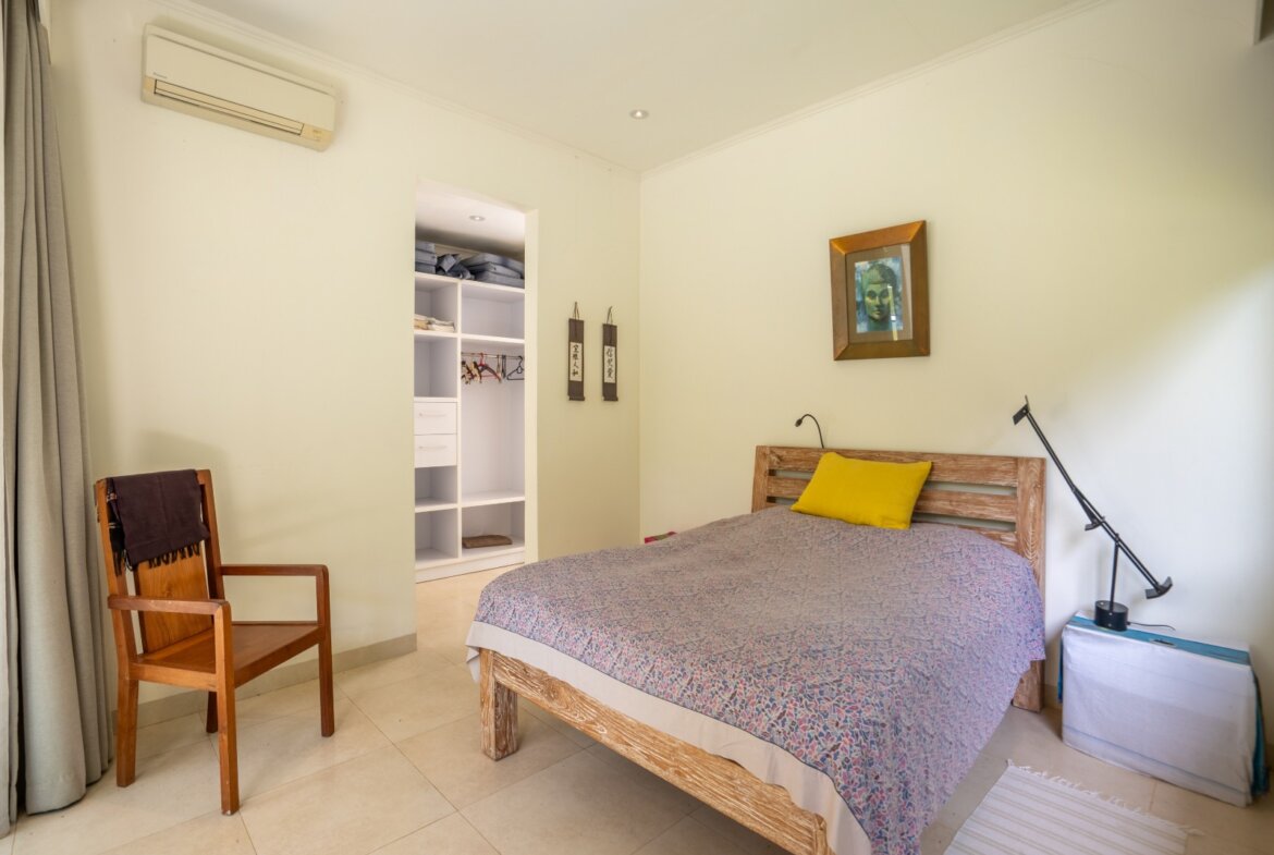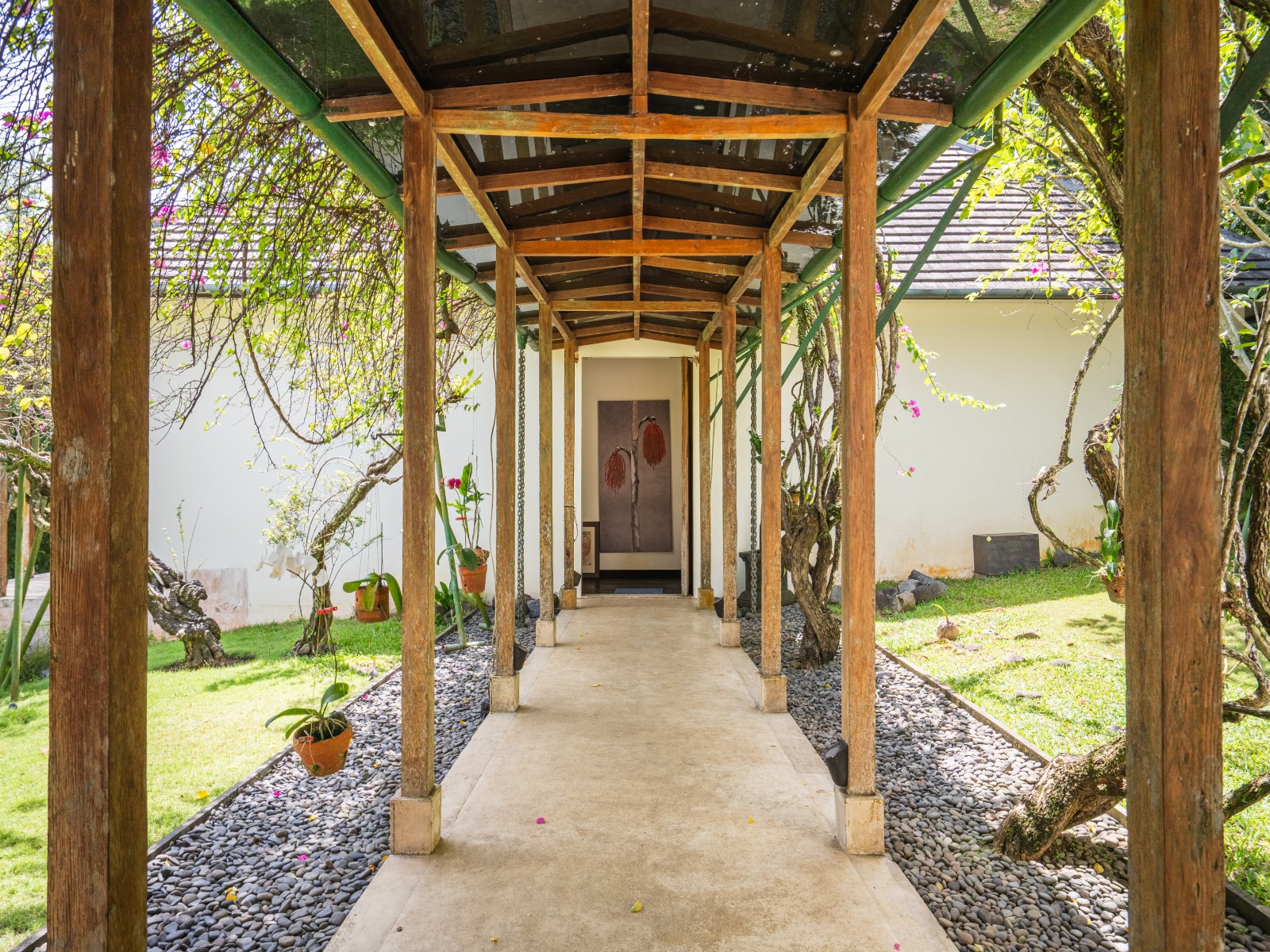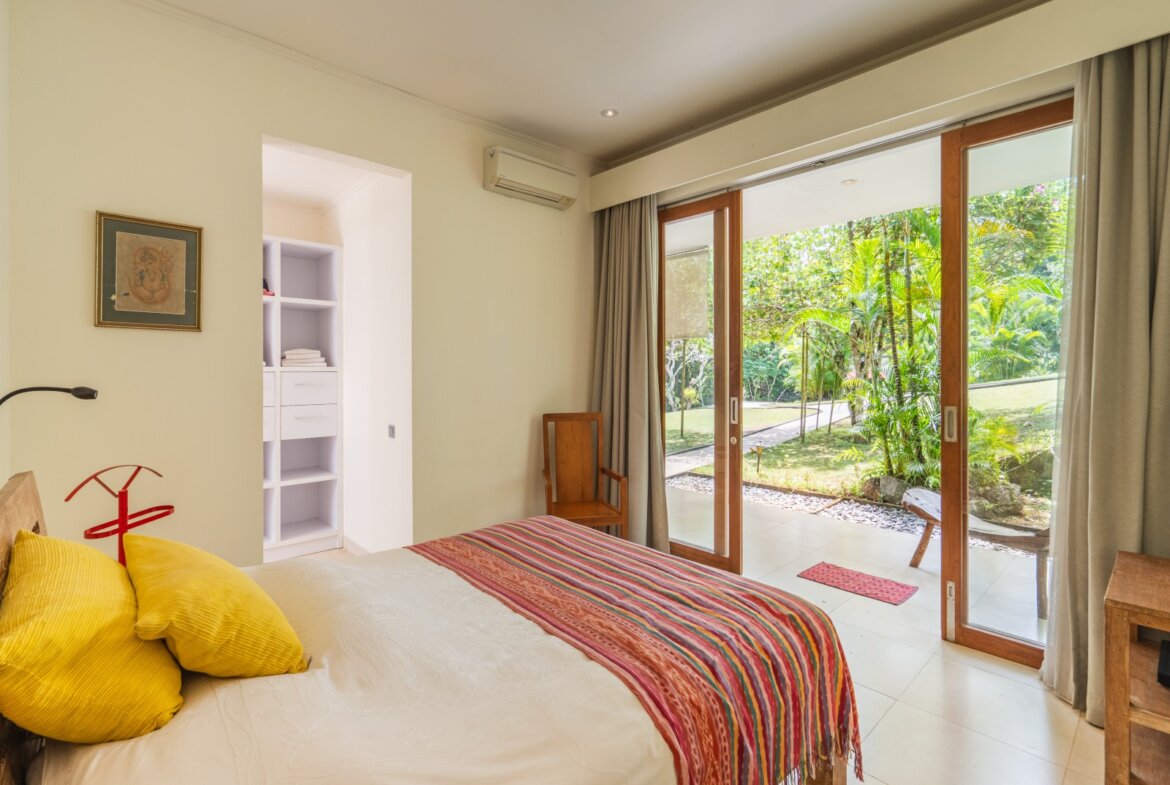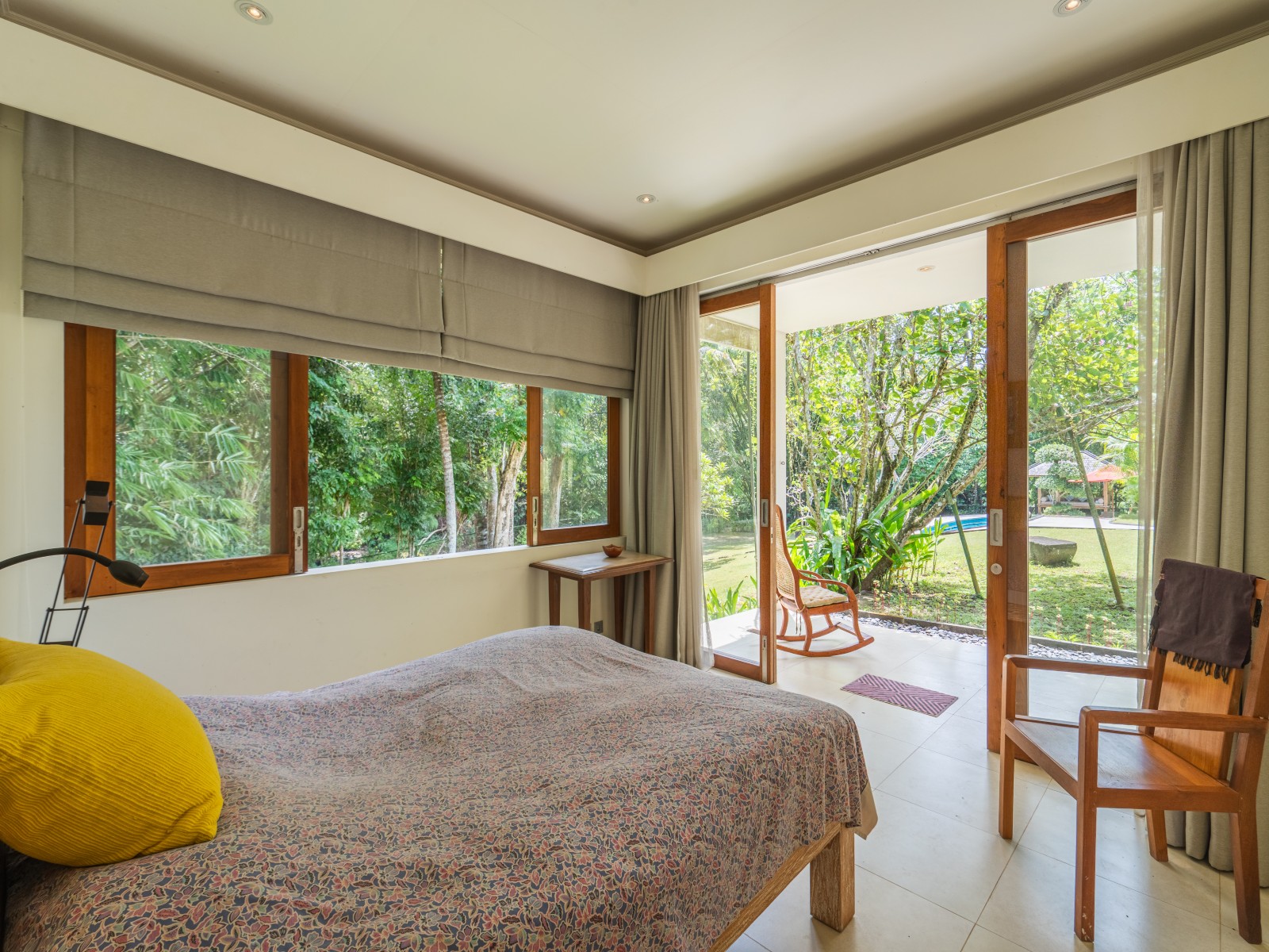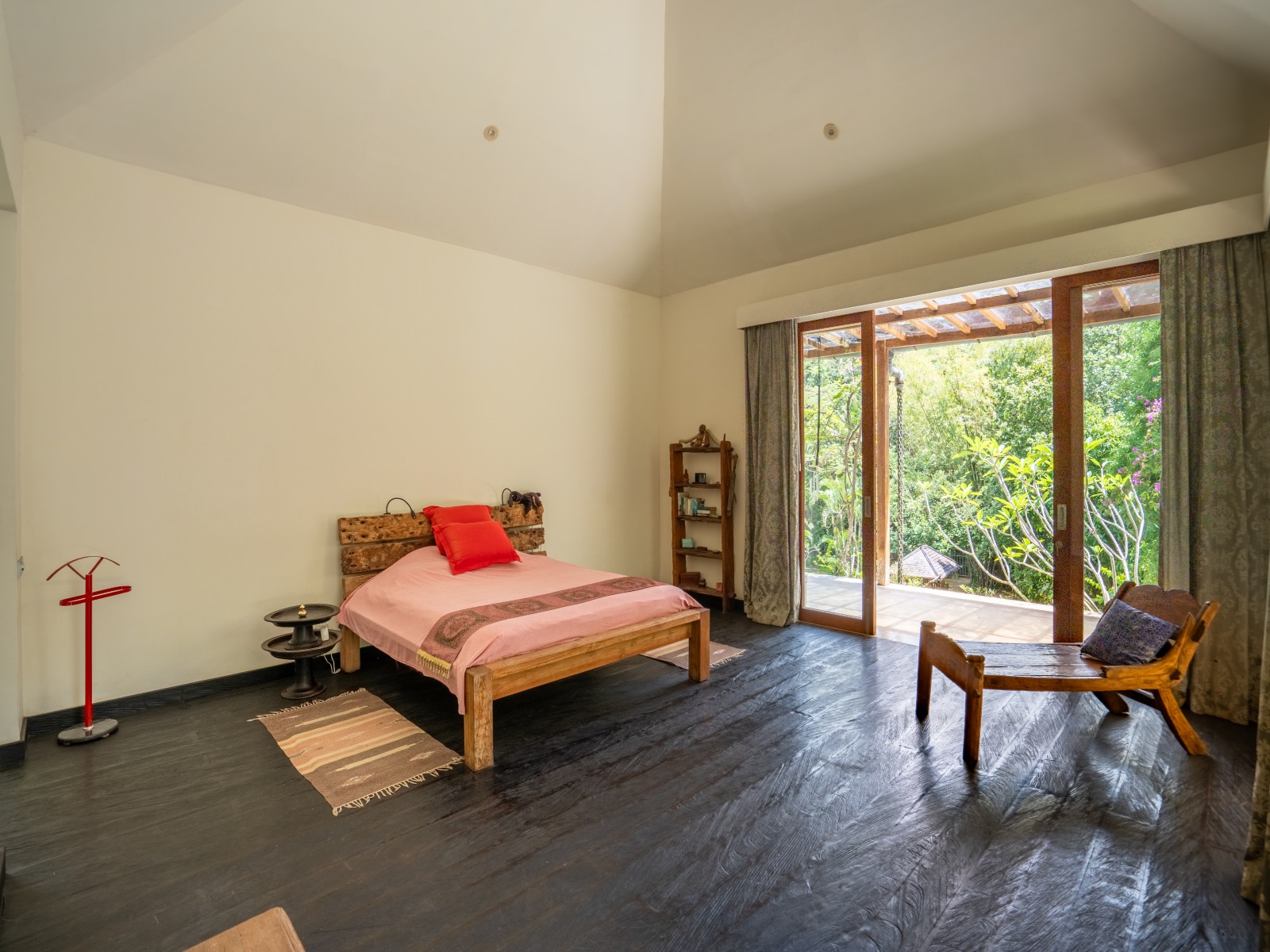To the right of the main residence is the master bedroom pavilion, sheltered by a covered terrace on two sides, allowing for a seamless connection with the surrounding nature. The interior of the master suite showcases rich wooden flooring, a walk-in closet, and a generous open-plan bathroom complete with a built-in bathtub and separate shower.