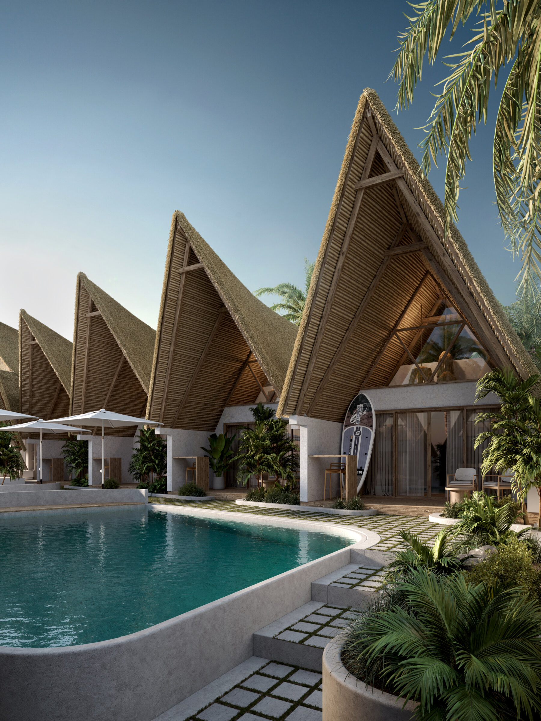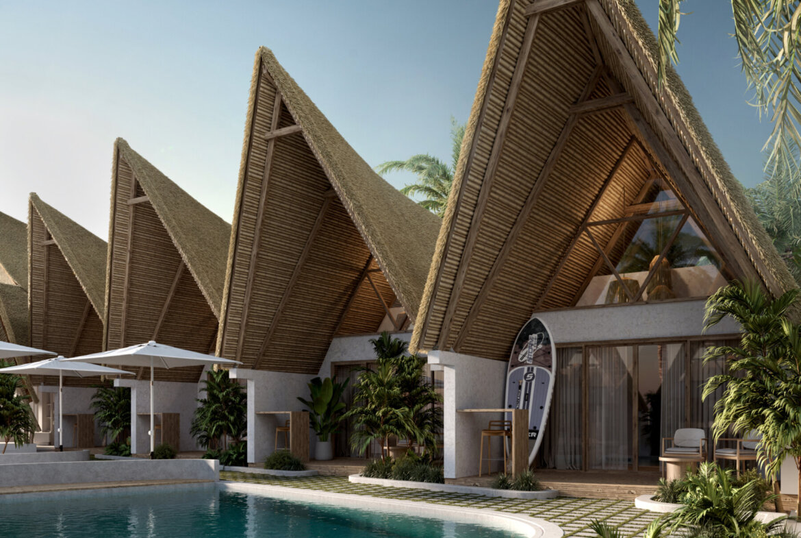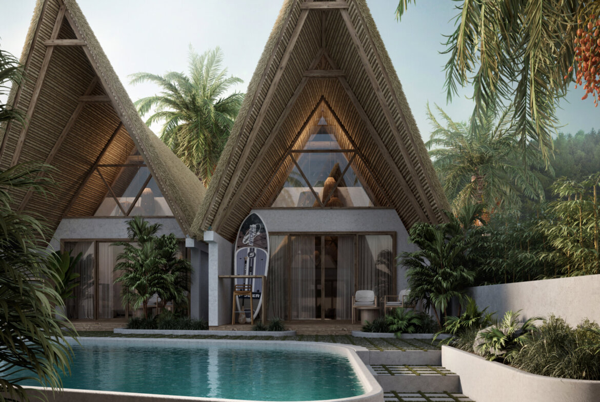 Each villa offers a total built area of 75 m² and is available on a 25-year lease with a priority option to extend for an additional 25 years, presenting a secure and attractive investment opportunity. Designed in a modern tropical bungalow style, the architecture blends traditional vernacular influences with contemporary resort aesthetics. The villas showcase thatched roofing, timber elements, and textured concrete, creating an organic, earthy character complemented by clean lines and simple forms.